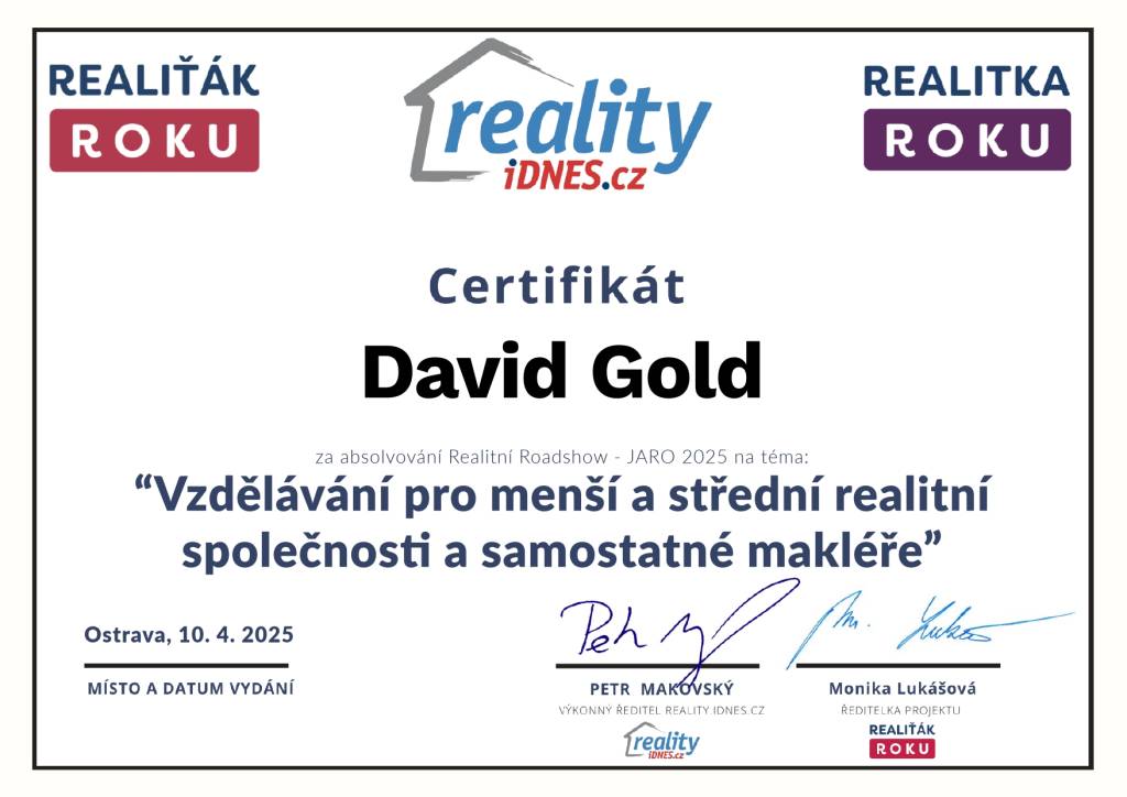 Realitního makléře pana Davida Golda jsem kontaktovala sama se žádostí o pomoc při prodeji mé nemovitostí. Velmi oceňuji ochotu , vstřícnost a profesionalitu jednání. Ale také lidské jednání. Vše proběhlo rychle a velmi profesionálně. Děkuji.