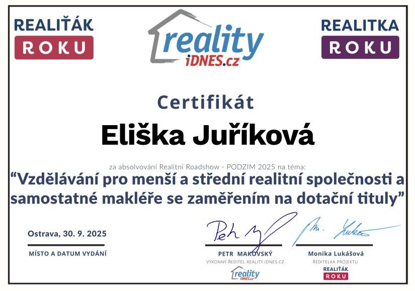 Jsem Eliška Juříková a bydlím v malé obci Černá Voda. Člověk prochází životem a stále se vyvíjí a učí se nové věci. Tak to mám i já. Měla jsem štěstí a začala pracovat v realitách. Začátky byly divoké ale strašně ráda na ně vzpomínám. S každým novým obchodem rostly mé znalosti a i klienti byli spokojeni. Zjistila jsem, že je to co chci v životě dělat. To nejsou jen prodané a pronajaté nemovitosti ale hlavně příběhy lidí, kteří se někam stěhují, mají nějaké obtíže a nebo si jen plní své sny. Je to jako nekonečný seriál, který mě moc baví. Absolvovala jsem spousta školení, abych svým klientům mohla nabídnou profesionální přístup k řešení jejich potřeb. Spokojený klient je odměnou za mou práci a doporučení je nejhezčí dárek. Kdysi mi jeden známý řekl že úsměv je nejhezčí dárek, který můžeš dát a nic tě nestojí. Jen tvé okolí bude veselejší a spoustě lidem také vykouzlíš úsměv na tváři a uděláš jim aspoň chvilku v životě hezčí.