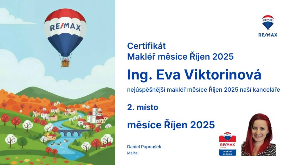 Chtěl bych poděkovat realitní kanceláři REMAX, jmenovitě Ing.Viktorinové za její profesionální přístup, ochotu řešit požadavky klienta i mimo pracovní dobu. Doporučuji všem, kdo chce koupit nebo prodat nemovitost či byt.