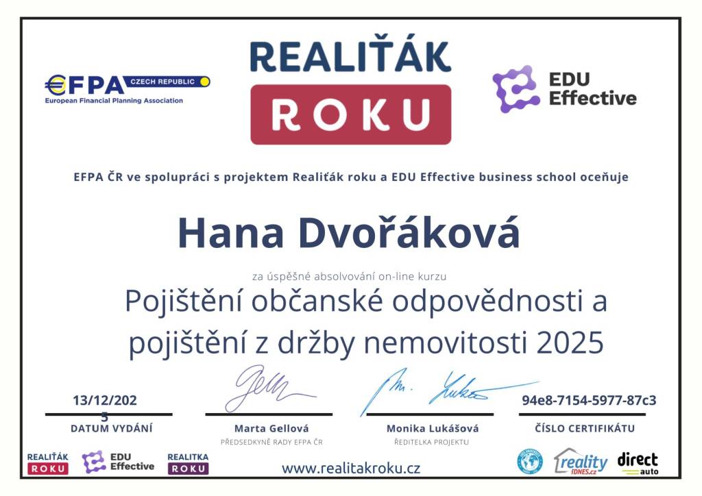 S pani Dvorakovou jsme byli velmi spokojeni. Prakticky kdykoliv byla na telefon, komunikace v poradku, domluva perfektni. I kdyz nas prodej domu a v navaznosti na to koupe druhejo byla dost narocna, tak jsme to dotahli do konce. Moc dekuji a v budoucnu se rada znovu obratim. Dekuji