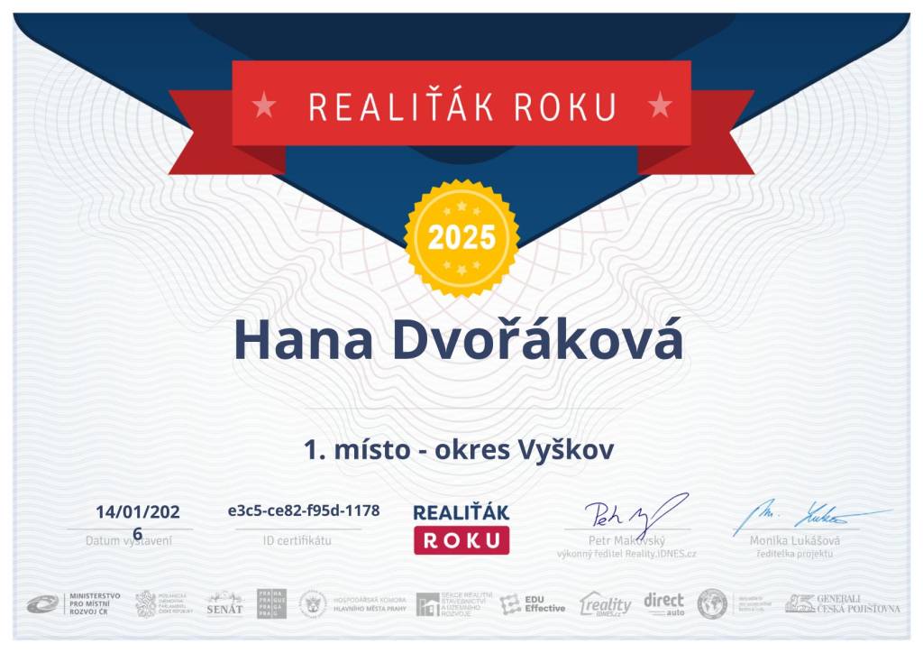 Ráda bych touto cestou poděkovala paní makléřce Haně Dvořákové – její profesionální přístup a dovednosti nám skvěle pomohly při prodeji staršího rodinného domu v Ruprechtově. Paní Dvořáková prokázala výbornou znalost trhu a efektivně zprostředkovala komunikaci mezi námi a potenciálními kupci. Oceňujeme především její pečlivost, ochotu a schopnost nalézt pro nás nejlepší řešení. Díky jejímu úsilí a nasazení proběhl prodej hladce a rychle. Jsme velmi spokojeni s její prací a vřele ji doporučujeme každému, kdo potřebuje profesionálního makléře.