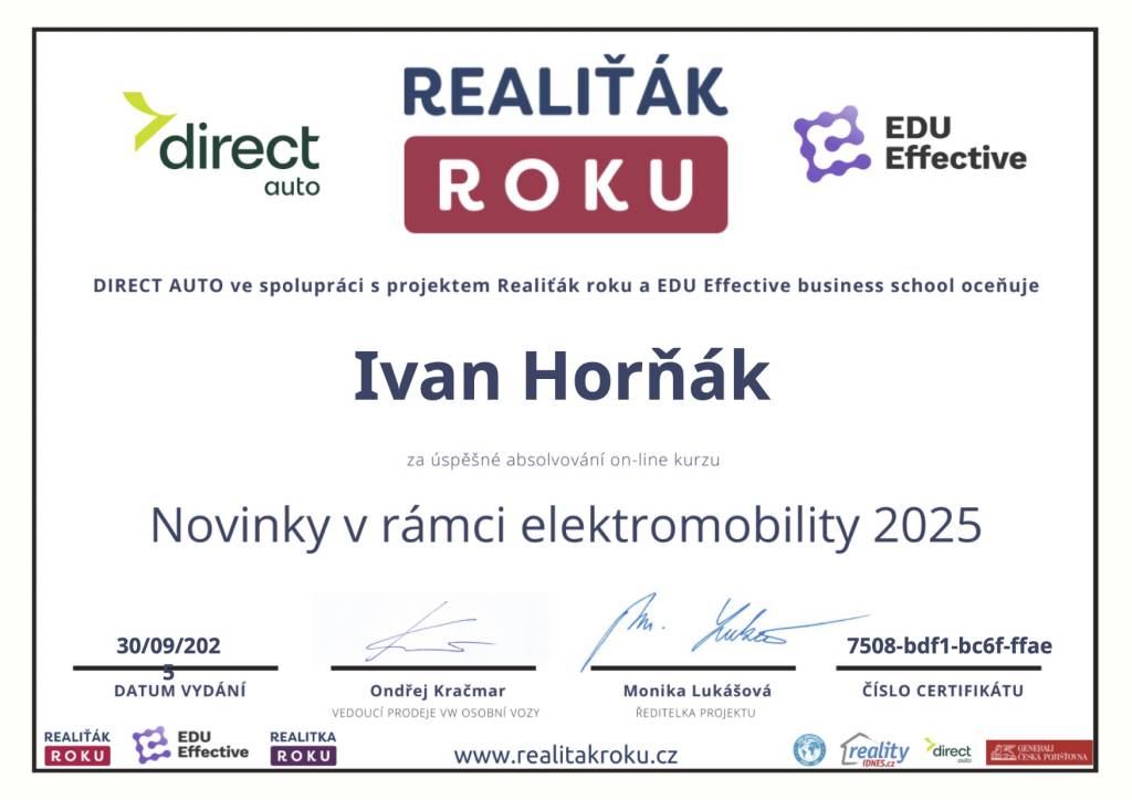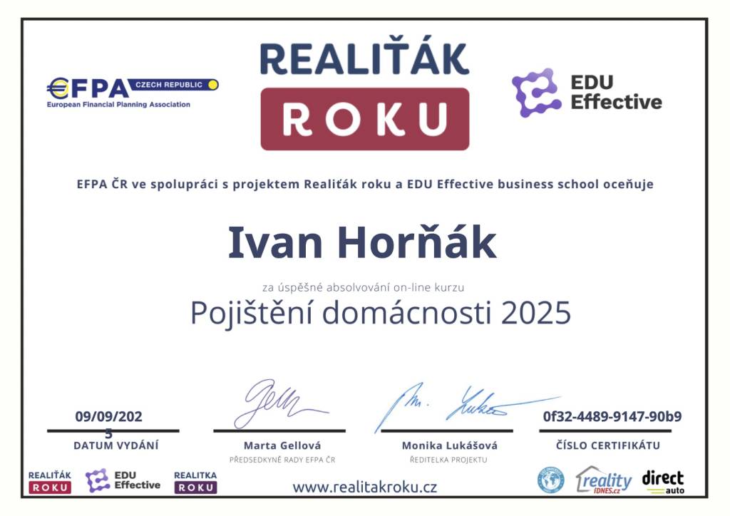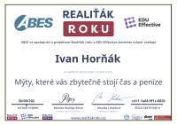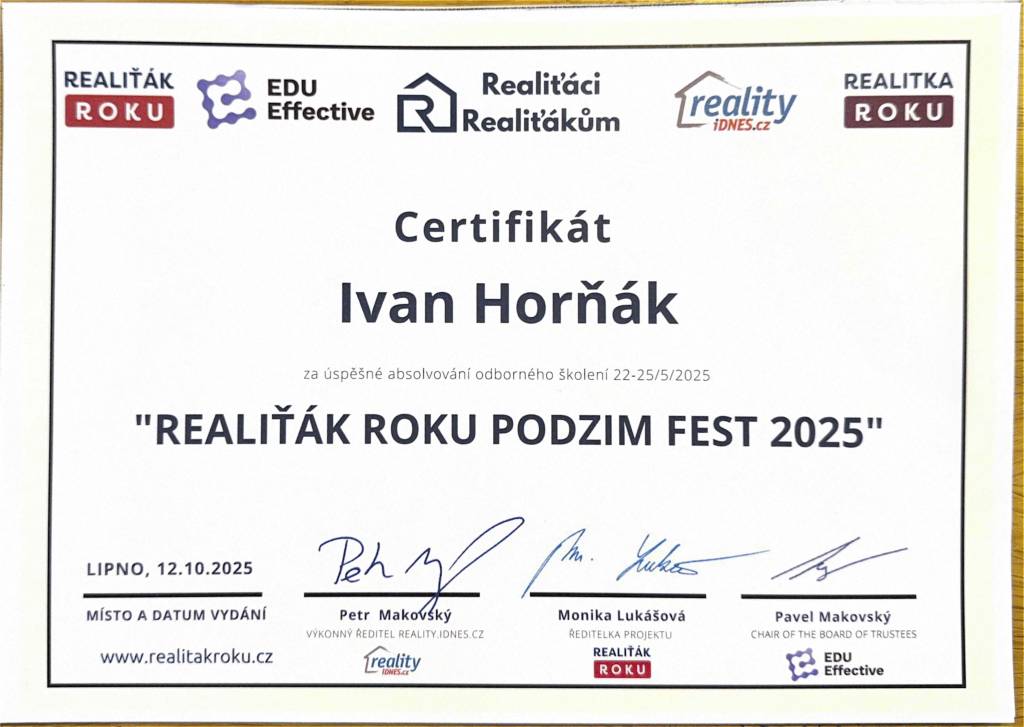 Jmenuji se Ivan Horňák. Realitnímu zprostředkování se věnuji už čtyřiadvacátým rokem. Díky Vaší důvěře, skvělým referencím a doporučením jsem prodal 721 nemovitostí. Specializuji se na prodej objektů k bydlení a rekreaci zejména na jihu Čech, úspěšně jsem ale prodal desítky nemovitostí i v Praze, středních Čechách, na Vysočině a na Plzeňsku. Realitní činnost je pro mě zajímavou, naplňující prací, zábavou i koníčkem. Fascinují mě moderní technologie, kterých k úspěšnému prodeji nemovitostí užívám - 3D sken nemovitosti, videoprohlídky se záběry z dronu, profi fotografie, 2D i 3D půdorysy, home staging, či foto staging. Profesně jsem stavař, jsem autorizovaným stavitelem pro pozemní stavby, autorizovaným technikem pro požární bezpečnost staveb ČKAIT. Jsem řádně registrovaným pilotem UAV (dronu) u ÚCL, s povolením k provádění leteckých prací. Jsem držitelem koncese pro tržní oceňování nemovitostí. S úctou a pokorou děkuji za Vaši přízeň, těším se na naši další spolupráci :-)