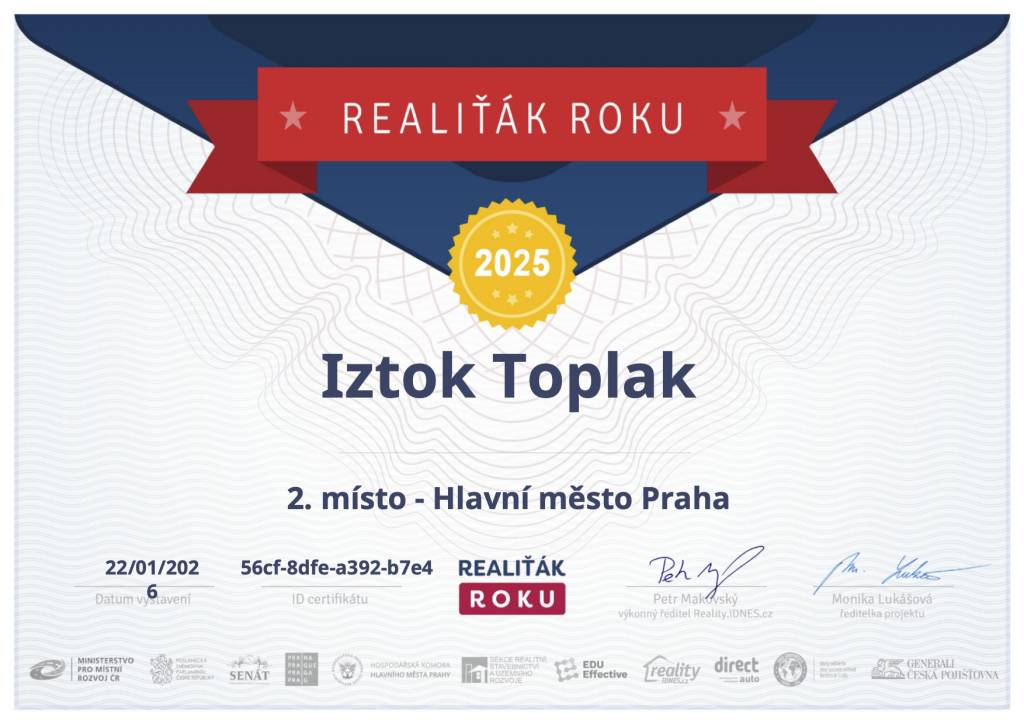 Iztok Toplak je lídr na českém realitním trhu s více než 30 lety zkušeností v oblasti prodeje a 12 lety v realitách. Jeho cesta k úspěchu je postavena na neustálém vzdělávání, odhodlání a etice. Jako držitel prestižní certifikace ISO 17024 a několikanásobný vítěz soutěže Realiťák roku se zaměřuje na poskytování špičkových služeb a budování důvěry na trhu. Iztok je nejen odborníkem ve svém oboru, ale také aktivním členem komunity, která se snaží zvyšovat standardy a transparentnost na realitním trhu v České republice. "Pomáhám lidem najít jejich vysněný domov nebo prodat nemovitost za nejlepší možnou cenu. Jako certifikovaný realitní makléř a několikanásobný vítěz soutěže Realiťák roku věřím v poctivý přístup, transparentnost a neustálé vzdělávání. Společně můžeme udělat z vašeho realitního snu skutečnost!"
