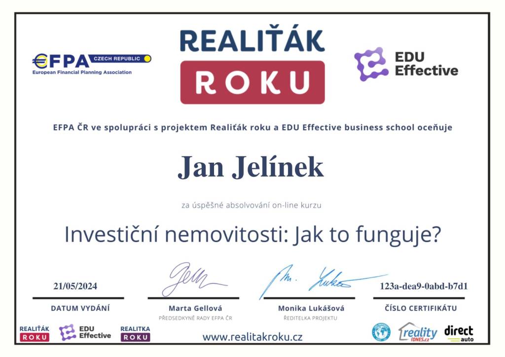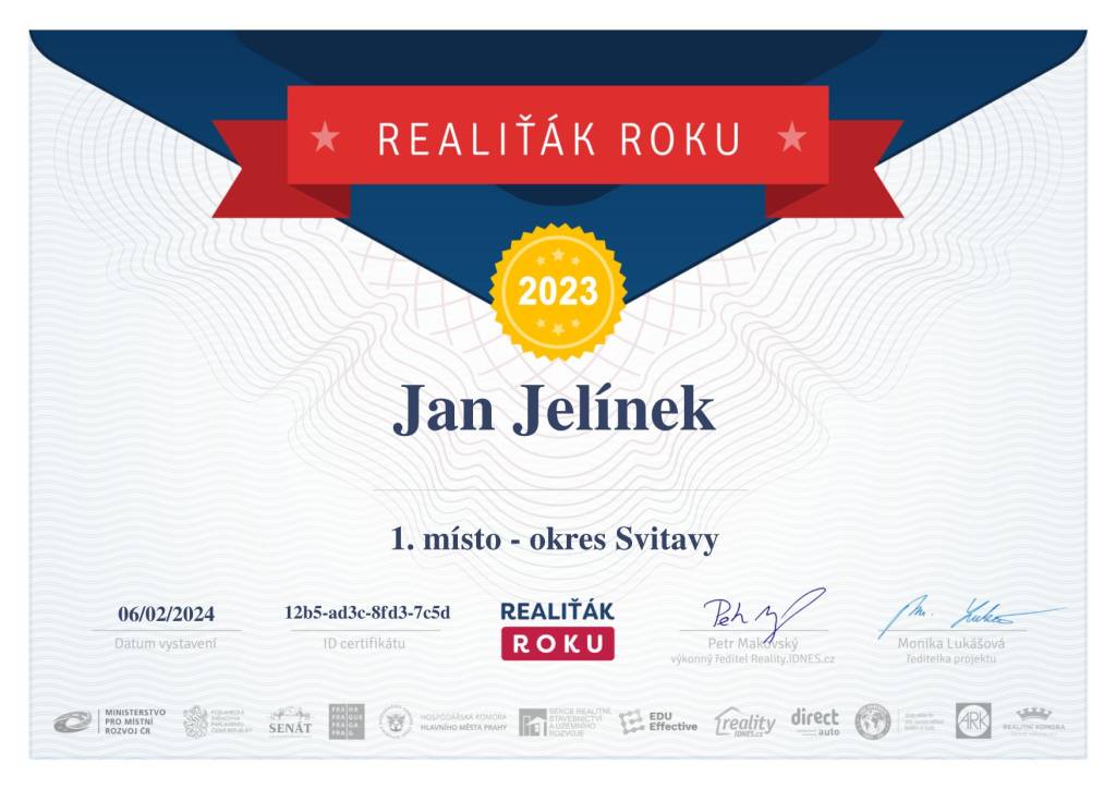 Služby pana Jelínka jsem využil při prodeji své první nemovitosti. Rozhodl jsem se tak na základě jeho kladných referencí a byl jsem velice spokojený. Od první schůzky jsem měl z prezentace jeho práce, lidského přístupu a znalostí dobrý pocit. Veškerá jednání, co jsme spolu měli, byla lidsky příjemná a zároveň velmi konstruktivní. Byt se prodal podle mého minimálně za tržní hodnotu v okolí Svitav. Ušetřil mi spoustu práce a starostí. Za své peníze dostanete velmi kvalitní realitní servis. V budoucnu bych se na něj neváhal znovu obrátit a pana Jelínka mohu s klidným svědomím jen doporučit.