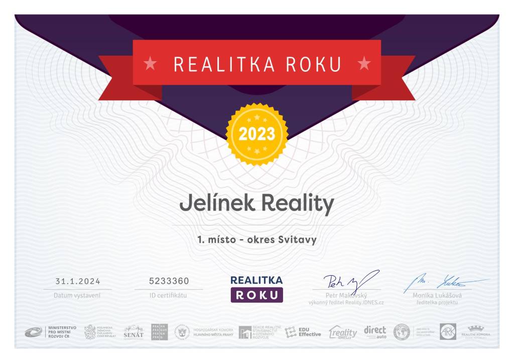 Bylo opravdu dobře, že jsme s panem Jelínkem prošli více domů v námi vybrané lokalitě, pak bylo rozhodování mnohem jednodušší. I zpětně oceňujeme standardizovaný a systematický postup při nabízení nemovitosti. Díky pečlivé prezentaci jsme se vždy dobře zorientovali, rozdíly mezi nemovitostmi tak mohly krásně vyniknout. Vždy jsme přesně věděli, co můžeme očekávat, a některé domy jsme tak s klidným srdcem přenechali ostatním už podle popisu a fotografií. Situaci nám také zjednodušila jeho specializace na lokalitu, kde jsme právě hledali a to, že z nějakého záhadného důvodu měl prakticky všechny zajímavé nemovitosti u sebe na webu zrovna on :-) Jako perličku dodám, že mě pan makléř v polovině ledna upozornil na nutnost podat daňové přiznání i se stručným návodem, maličkost, ale potěšilo.