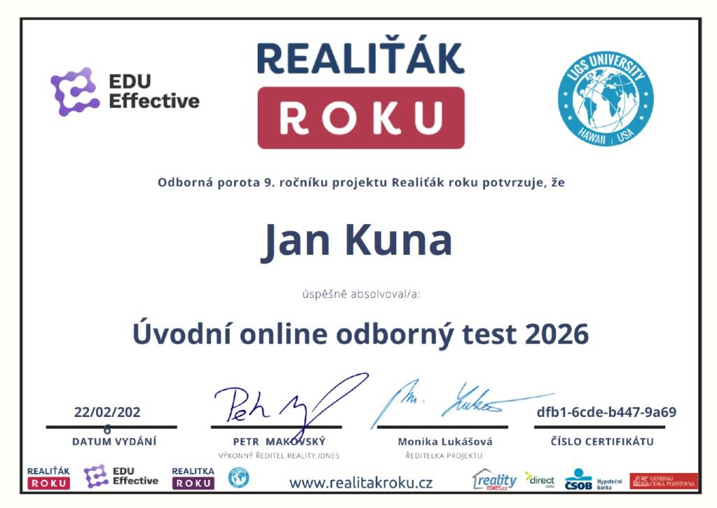 "Máte v týmu profíka a asi o tom ani nevíte. Péče makléře J. Kuny vůči klientům je dokonalá. Naše spokojenost je maximální. Na cokoliv jsme se ho zeptali věděl odpověď. Poradil a pomohl se vším i nad rámec svých povinností. Vždy s námi jednal na rovinu. Je ochotný, snaživý a zkušený. Nemáme ani jednu výtku. Plaťte ho zlatem! Dlouho jsme nezažili takové profesionální jednání. Děkujeme!"