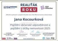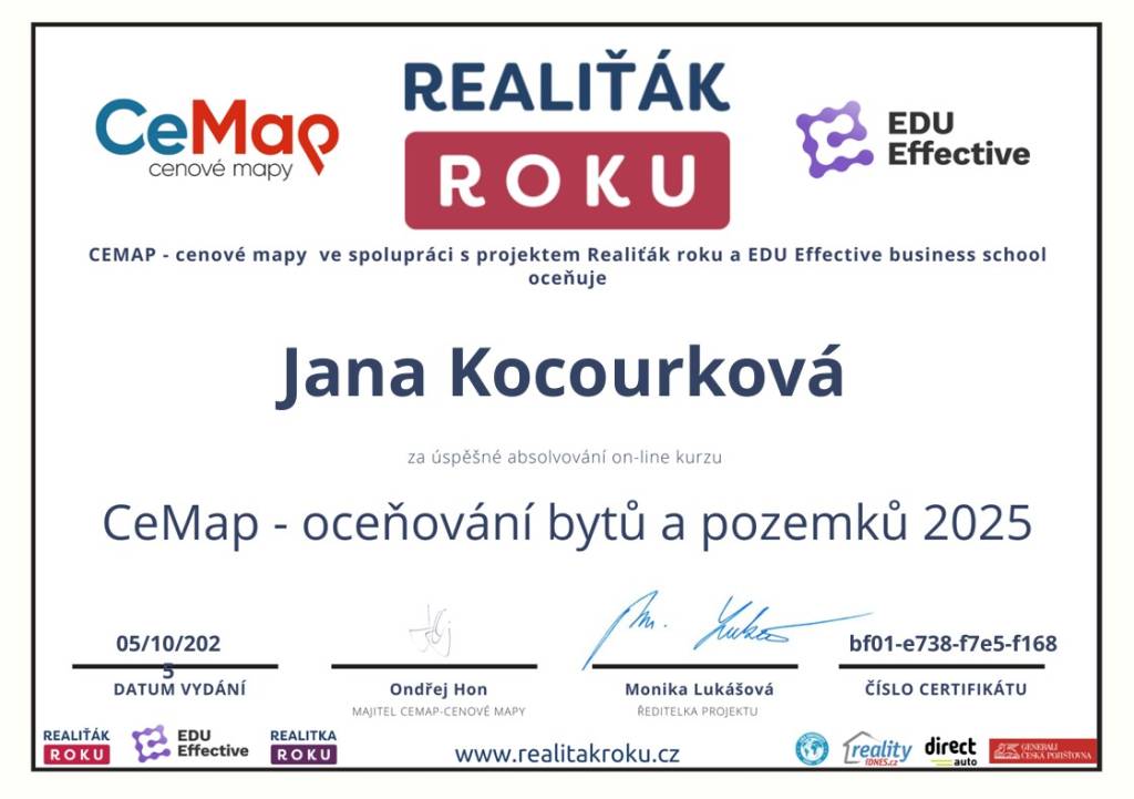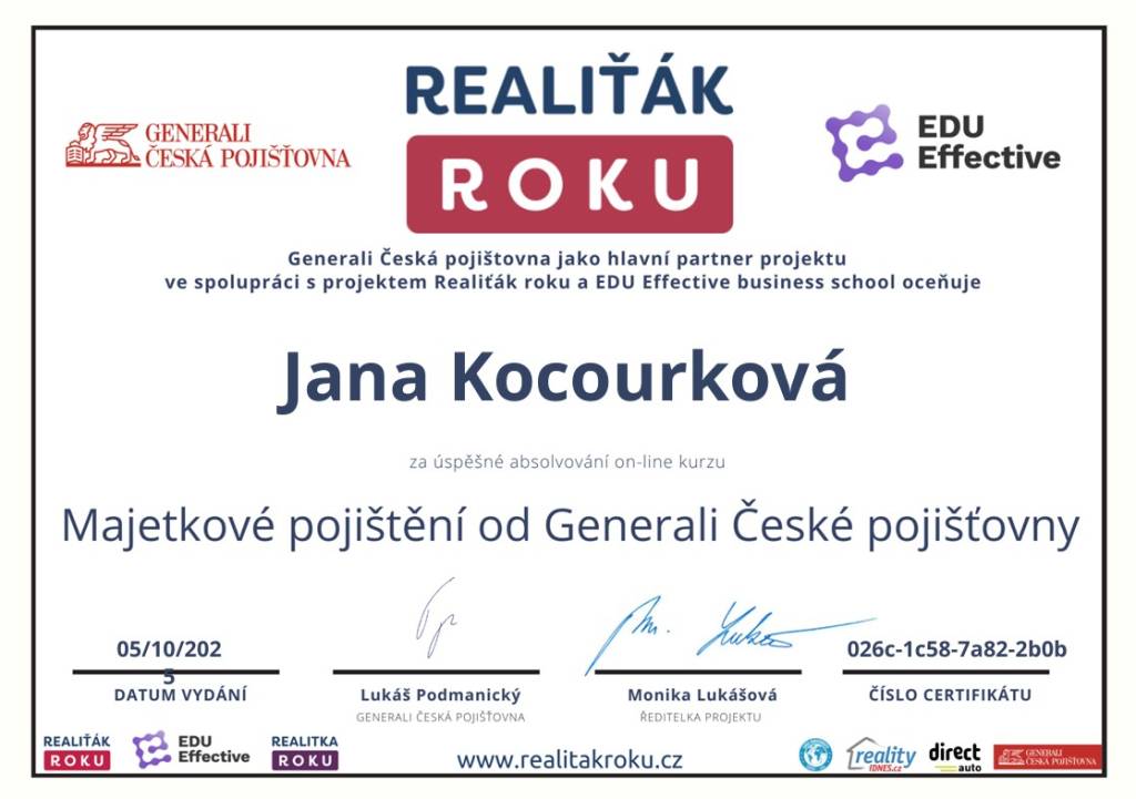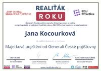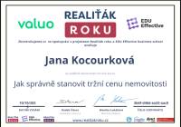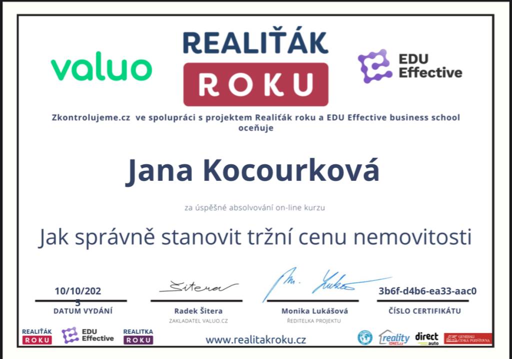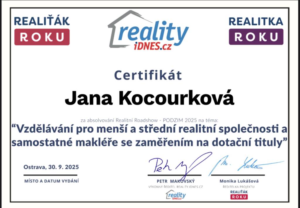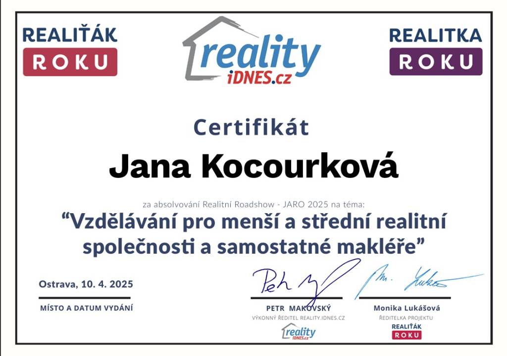 Jmenuji se Jana Kocourková, pocházím z Valašska a tady také působím. V oblasti realit se pohybuji již od r. 2011 v realitní kanceláři Reality Kocourek s.r.o.. Poskytujeme profesionální služby oceňování nemovitostí, znalecké posudky, vizualizace, fotografie od profesionálního fotografa, matterport, 3D scan nemovitostí, půdorysy. Natáčíme záběry z dronu a zajišťujeme veškerý právní servis a také pomoc s financováním pomocí hypotéky. Já osobně mám ke klientům přátelský a osobní lidský přístup. Věnuji se dalšímu sebevzdělávání a sleduji aktuální dění v oblasti s nemovitostmi. Mí klienti se na mne obracejí s důvěrou opakovaně, pracuji tedy převážně na doporučení od spokojených klientů.