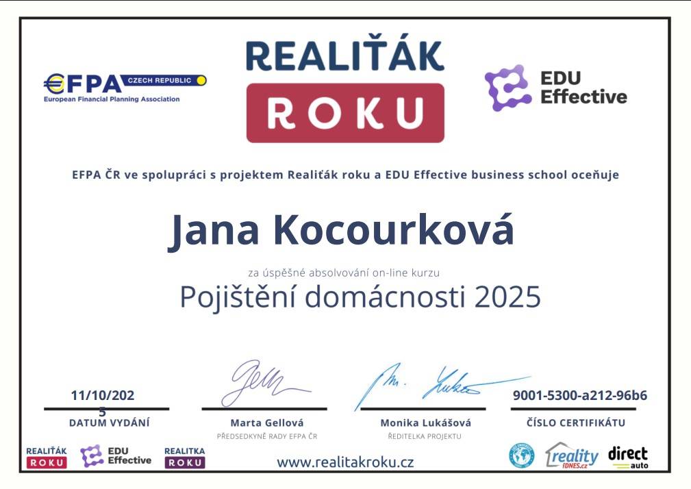 Bc. Jana Kocourková, DiS. Děkuji za vysoce profesionální a zároveň lidský přístup při zprostředkování koupě nemovitosti.