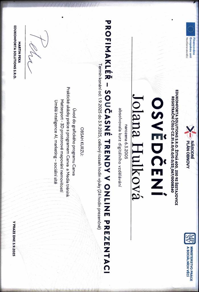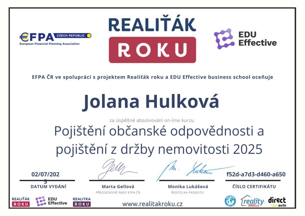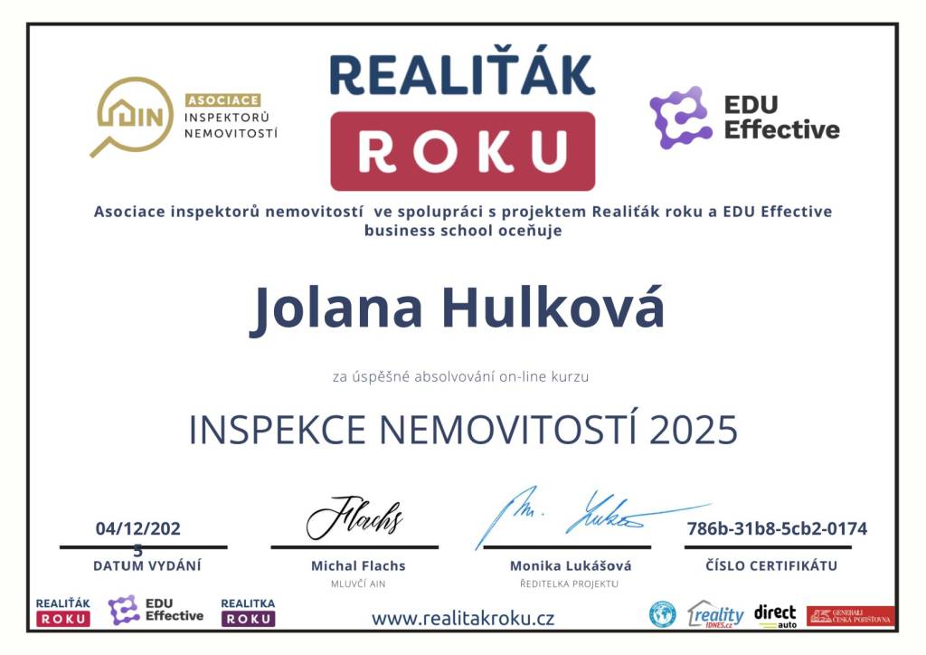 Jmenuji se Jolana Hulková a pracuji jako realitní makléřka. I když je mi teprve dvacet let, svět nemovitostí a stavebnictví mi není cizí – vyrůstala jsem totiž v rodině, kde se o stavbách mluvilo každý den. Můj tatínek celý život podniká ve stavebnictví, a tak jsem už odmala měla možnost sledovat, jak vznikají domy doslova od základů. Právě díky tomuto zázemí mám ke stavebnímu a realitnímu prostředí velmi blízko. Studovala jsem na Ekonomické fakultě, obor Účetnictví a daně, protože vnímám, že pevný základ ve financích a daňové problematice je v realitním světě obrovskou výhodou – nejen pro mě, ale hlavně pro mé klienty. Snažím se propojovat znalosti ze studia s praxí a vždy hledat individuální a zodpovědný přístup k lidem i k jejich potřebám. Realitní činnost mě baví, protože kombinuje práci s lidmi, orientaci na detail a smysl pro prostor. Každá nemovitost má svůj příběh – a já jsem tu od toho, abych pomohla psát ten další.