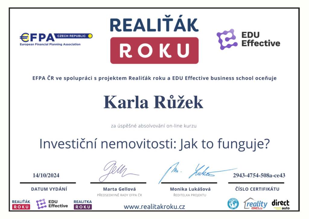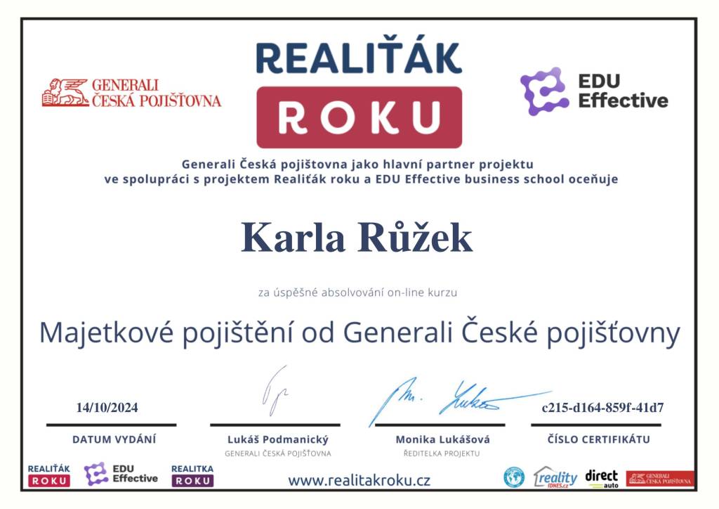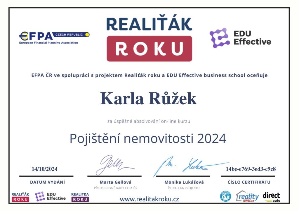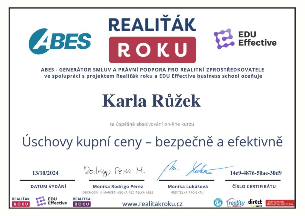 Pokud hledáte spolehlivého partnera při koupi či prodeji nemovitosti, mohu tuto realitní kancelář i konkrétní makléřku s čistým svědomím doporučit. Děkuji ještě jednou za skvělou spolupráci!