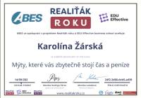 Paní Karolíny Žárské si velice vážím za její nanejvýš profesionální přístup při práci na "poli realitního trhu". Neexistuje, že by za sebou paní Žárská nechala něco jiného, než skvěle odvedenou práci. Oceňuji nejen její pracovitost, pružnost, ochotu, vlídnost, ale i přehled po odborné stránce. Konec konců, "Realiťákem roku", se paní Žárská asi nestala opakovaně jen tak "za nic". Těžko si zkouším představit, kolik za tím muselo být každodenní dřiny. Ze spolupráce s paní Žárskou si vždy odnesu nejen osobní prospěch, ale i radost a zážitek, že se ještě něco, někde, přeci jen, dělá s velkým lidským rozměrem a nadšením. Až se mi chce říct, že paní Žárská vlastně ani žádnou reklamu a doporučení dalším lidem "nepotřebuje". Proč dělat reklamu někomu, koho všichni chtějí ? :-) Přeji hodně štěstí a plno sil do další práce a těším se na další spolupráci. Martin Frič