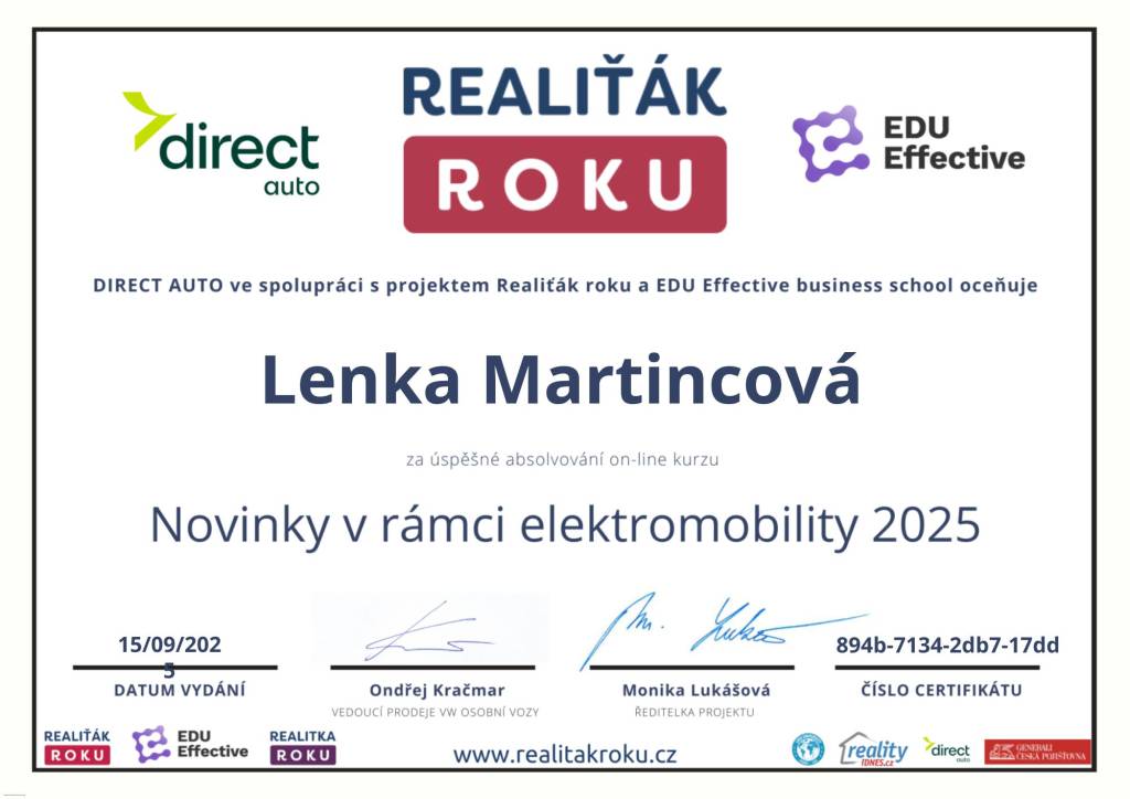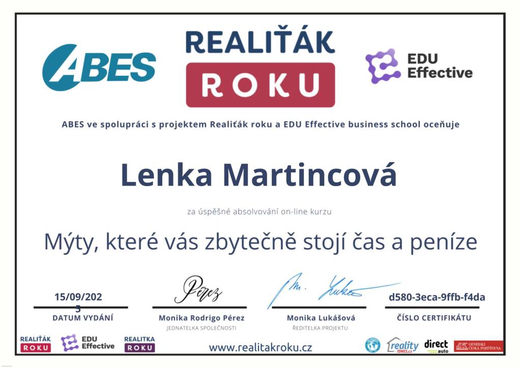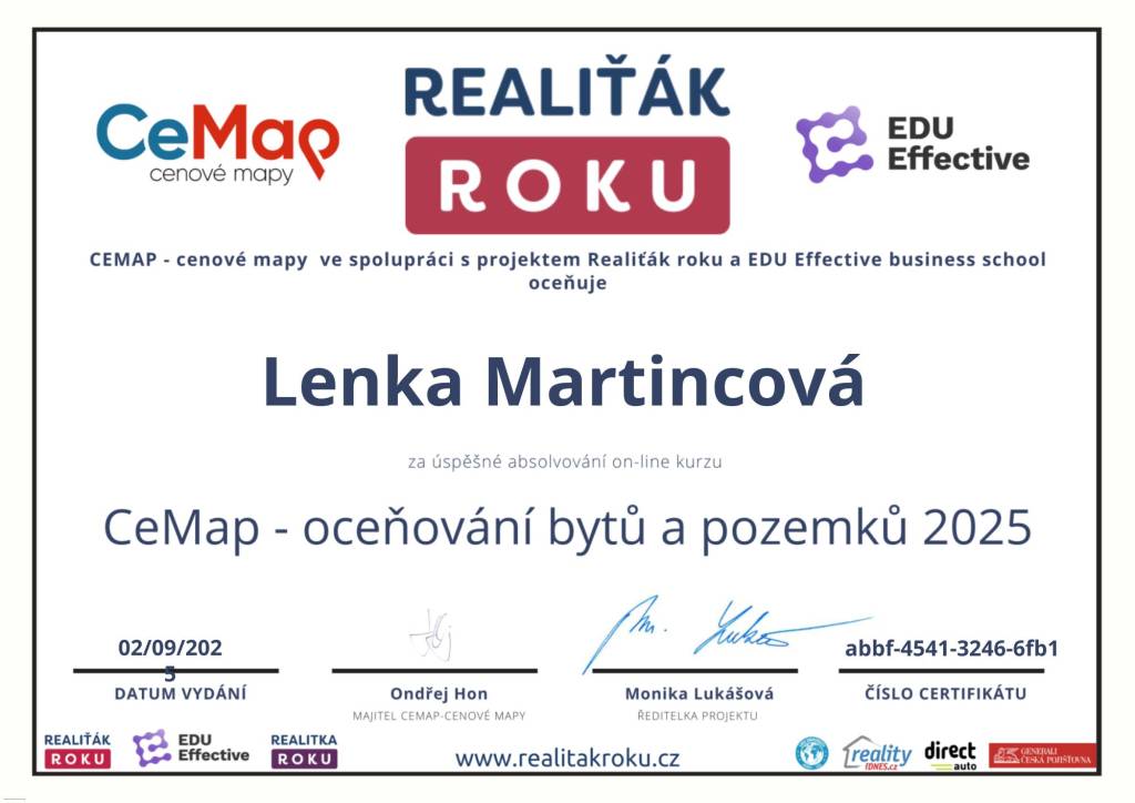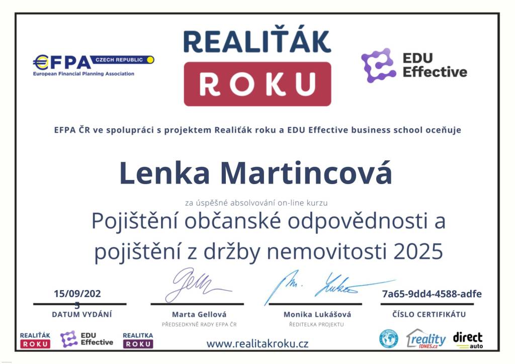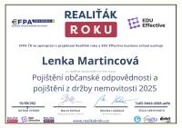 Měl jsem možnost spolupracovat s realitní makléřkou Lenkou Martincovou a mohu ji vřele doporučit. Lenka odvádí svou práci s maximálním nasazením a často i nad rámec běžných povinností. Je proaktivní, flexibilní a dokáže se perfektně přizpůsobit životní situaci všech zúčastněných stran. Díky její profesionalitě, ochotě a empatii probíhá celý proces hladce a ke spokojenosti všech. I přes občasné překážky dokázala vše dotáhnout do konce, a to i některé záležitosti řešila i po uzavření obchodu samotného. V minulosti jsem poznal i jiné makléře při nákupu a prodeji nemovitostí – její přístup je ale rozhodně nadprůměrný. Lenka by měla být inspirací pro všechny, kdo se chtějí realitám věnovat profesionálně, a novým klientům ji mohu jen doporučit. :)