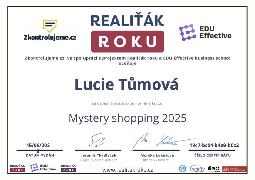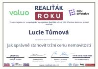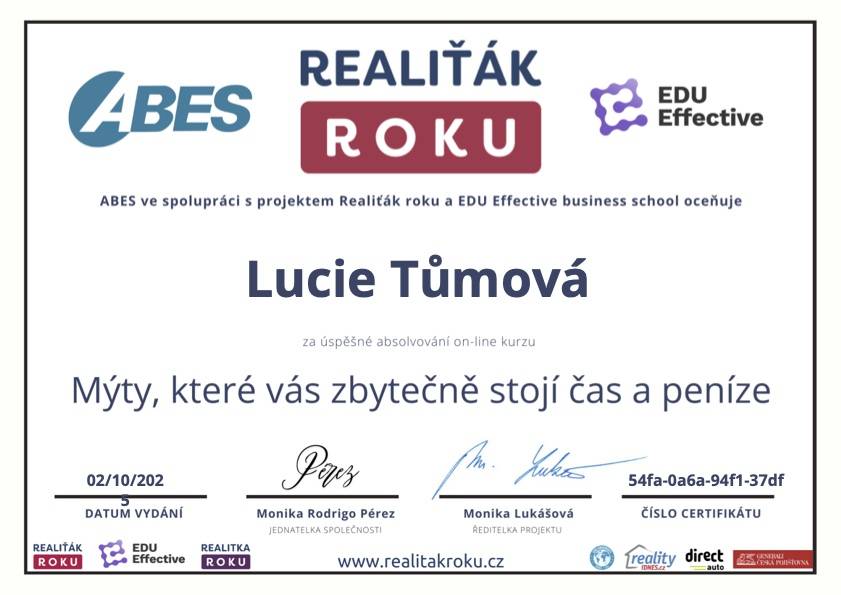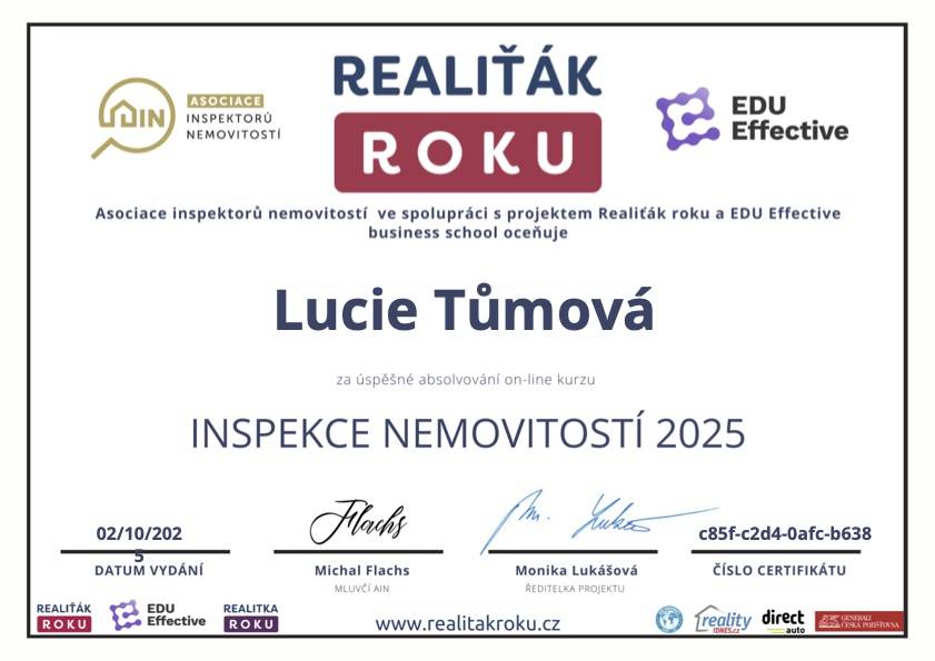 Paní Lucie Tůmová absolutně vyvrátila můj pesimistický postoj k fungování realitního trhu u nás. Roky jsem si mylně myslel, že až přijde čas a rozhodnu se k prodeji svého domu, vše si zařídím sám. Ovšem od prvotního kontaktu s touto makléřkou jsem byl vyveden z omylu. Již samotná prezentace nemovitosti, zejména virtuální realita, na mě zapůsobila doslova nadčasově. Díky ní se zájemci, i v této rouškové době, rychle zorientovali a po pár týdnech bylo prodáno. Dále díky zkušenostem, přehledu a samozřejmě pracovitosti paní Lucie, se vše hladce dotáhlo do konce. Počínaje doporučením možností financování novým majitelům až po kompletní právní servis. Kdykoliv bych v budoucnu potřeboval realitní servis, rozhodně vím kam se obrátit. Děkuji.
