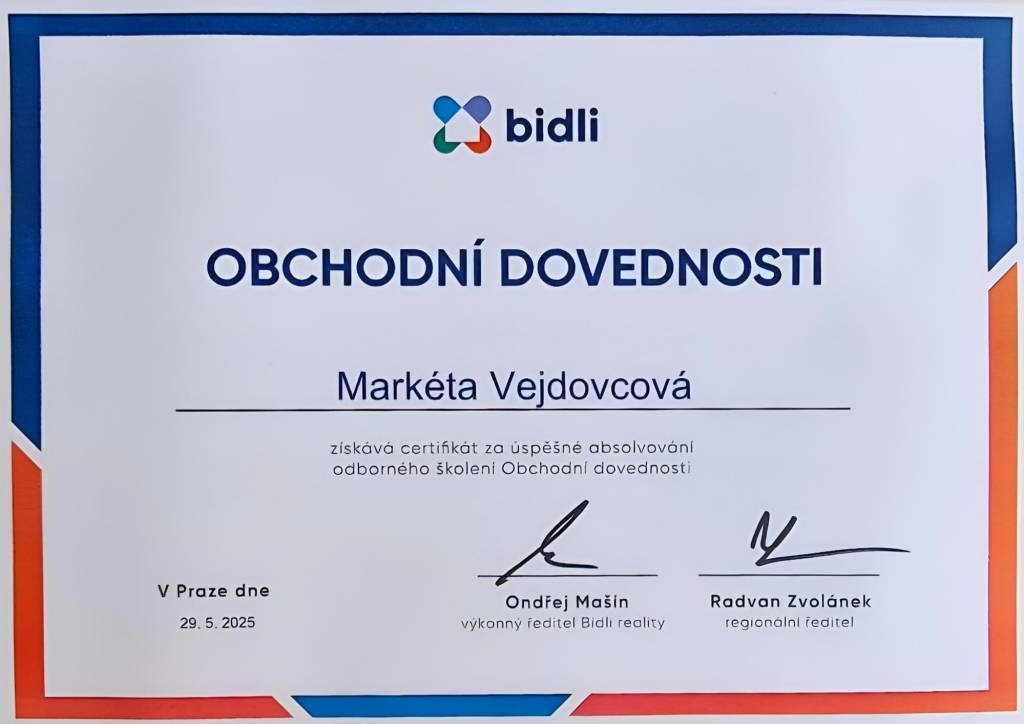 S realitní specialistkou Markétou Vejdovcovou se prodej zdárně uskutečnil, vše proběhlo bez problémů pro mě jako prodávající i pro stranu kupující.