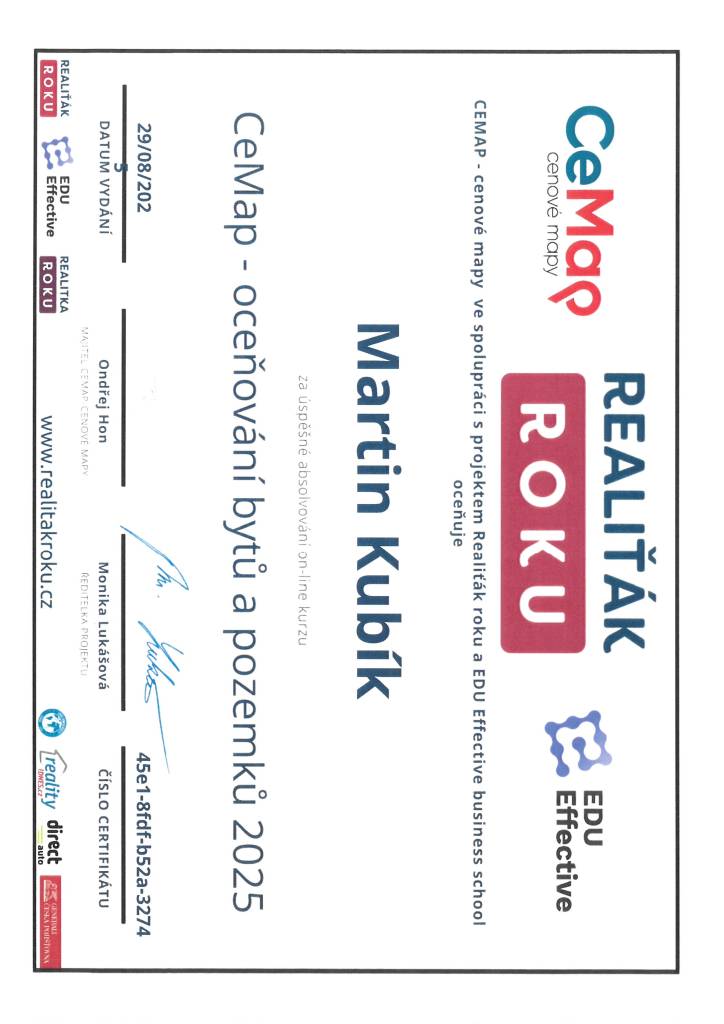 Služby pana makléře Kubíka /a to na základě své velice dobré zkušennosti při prodeji svého pozemku/mohu doporučit. Jedná se o člověka s vysoce postavenými profesními i lidskými kvalitami, který odvádí zodpovědě svoji práci, ke spokojennosti svých klientů, což vyplývá i z mé trpké zkušennosti v jednámí s jinými makléři od jiných realitních firem.