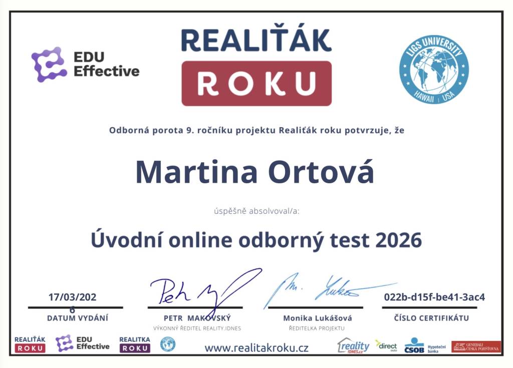 Jmenuji se Martina Ortová a v realitním oboru působím již několik let. Za tu dobu jsem pochopila, že úspěch nestojí jen na znalostech trhu, ale především na osobním přístupu, důvěře a pečlivosti. Během let jsme se rozrostli a dnes zajišťujeme kompletní realitní servis. Zabýváme se koupí, prodejem i pronájmem nemovitostí, poskytujeme plný právní servis, zajišťujeme přepisy energií, odhad nemovitostí (zejména pro dědická řízení) a také pojištění všeho druhu. Umíme rovněž prověřit nájemníky v databázích dlužníků nebo vypracovat PNeB. Zakládám si na rychlé, přehledné komunikaci a hladkém průběhu celého procesu. Veškeré služby poskytujeme klientům zdarma. Mou odměnou je spokojenost klientů, kteří se na mě s důvěrou opakovaně obracejí.
