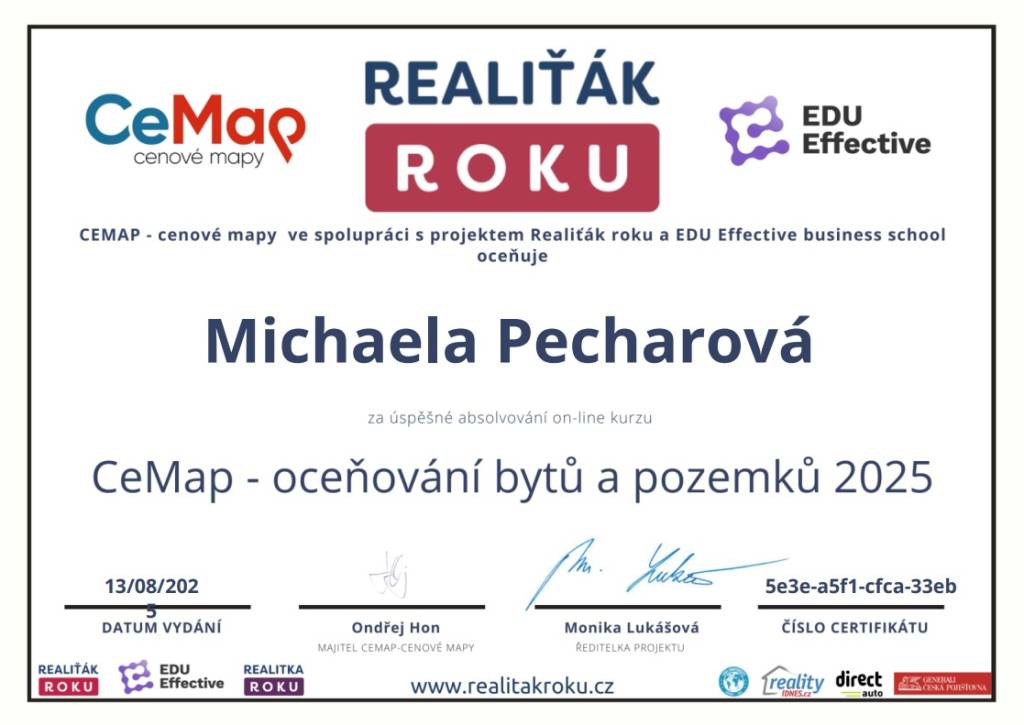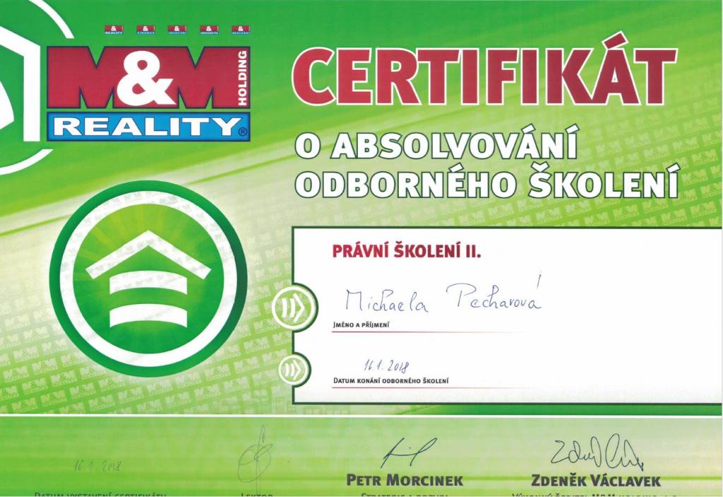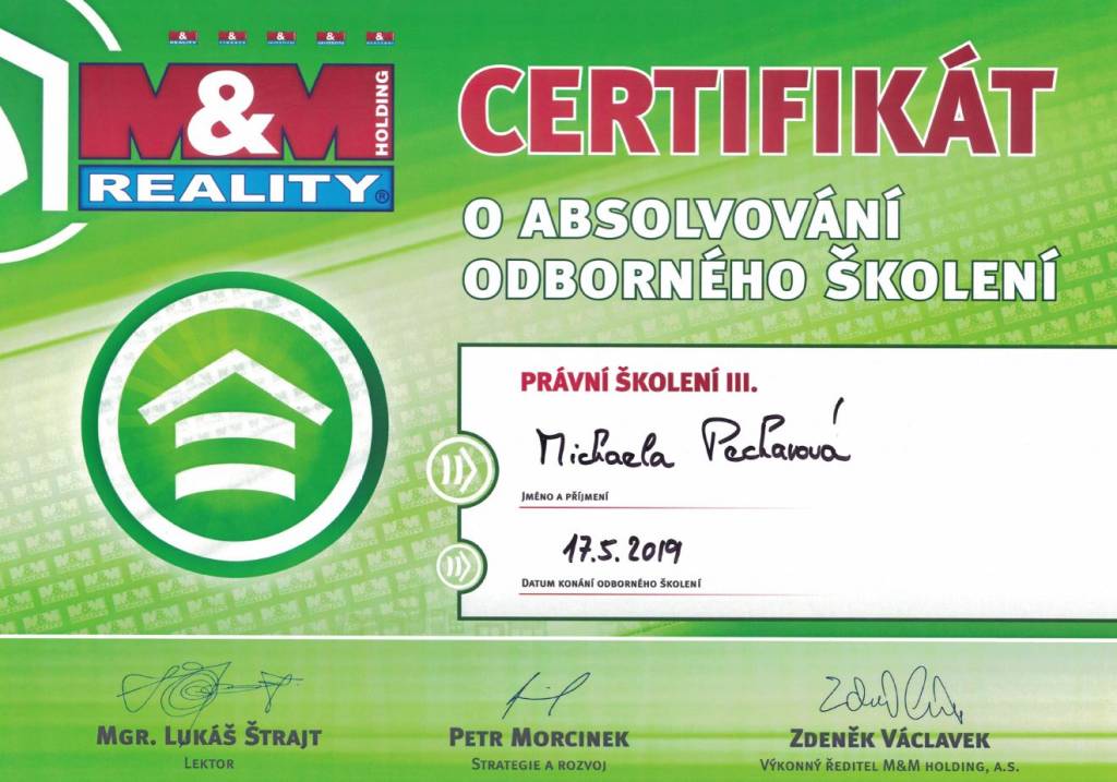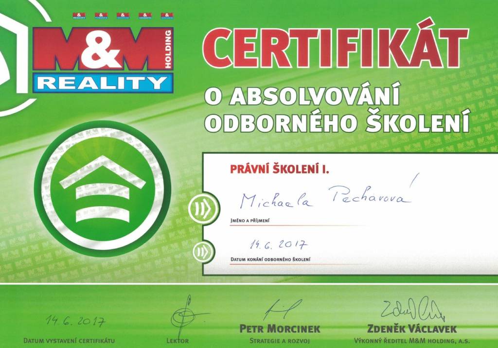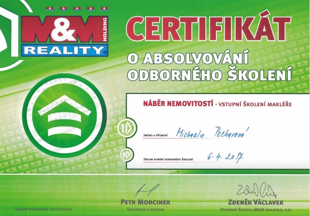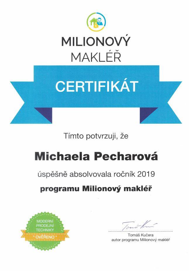 Chtěla bych poděkovat paní Michaele Pecharové ze společnosti M&M reality za její profesionální přístup, vstřícnost a plné nasazení při prodeji mojí nemovitosti. Je to makléřka na svém místě kde její práce je zároveň koníčkem a provedla mě celým složitým procesem s nadhledem k mojí naprosté spokojenosti.