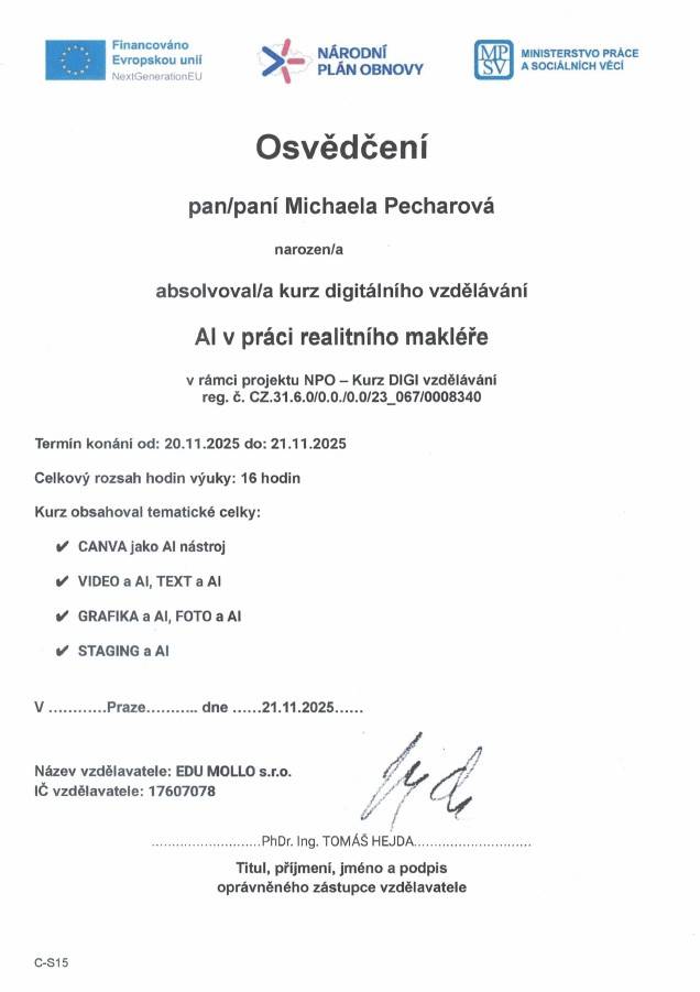 Se službami makléřů jsem byli spokojeni. V průběhu obchodu o všem pravidelně informovali. Paní Pecharovou doporučuji.