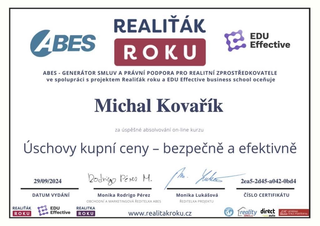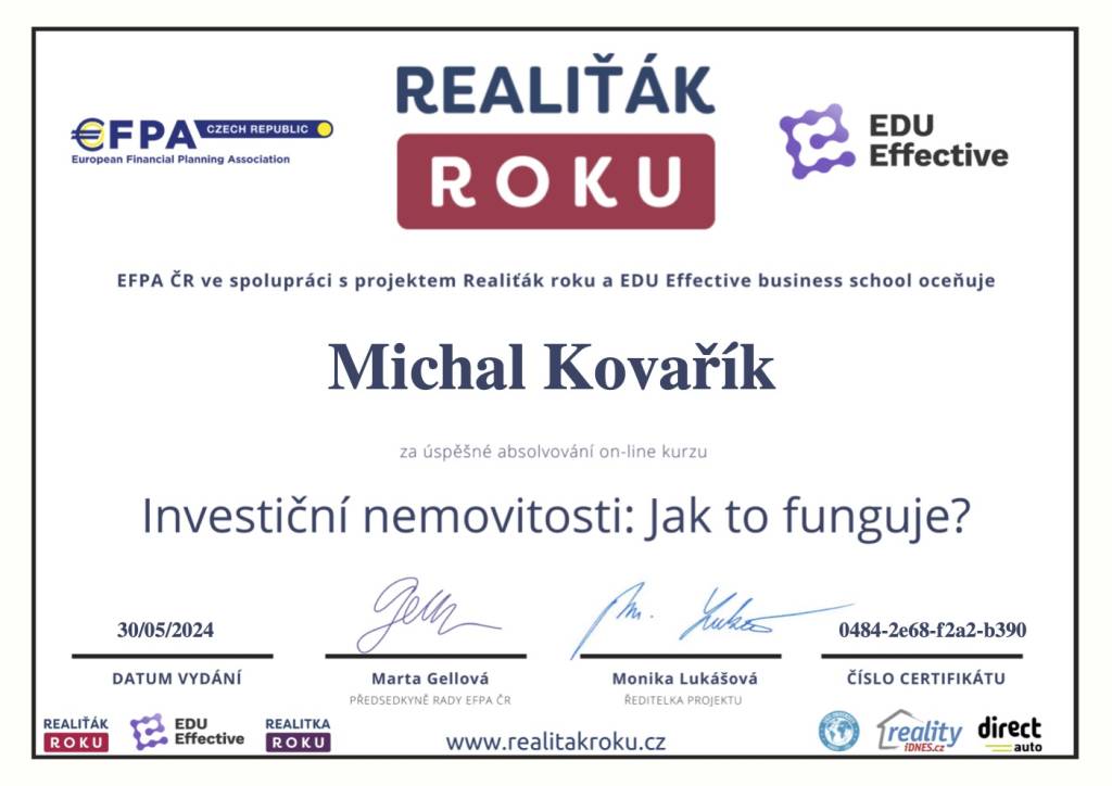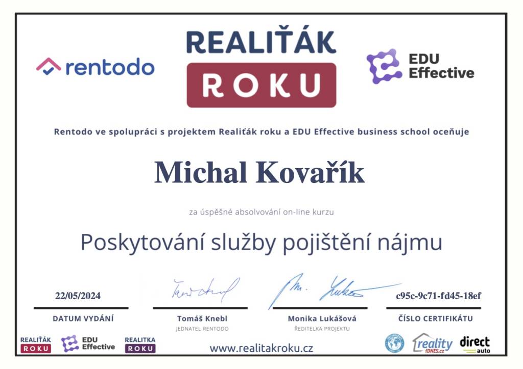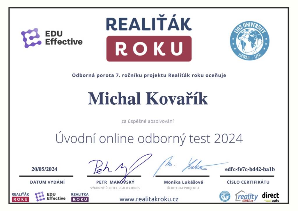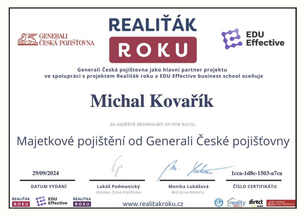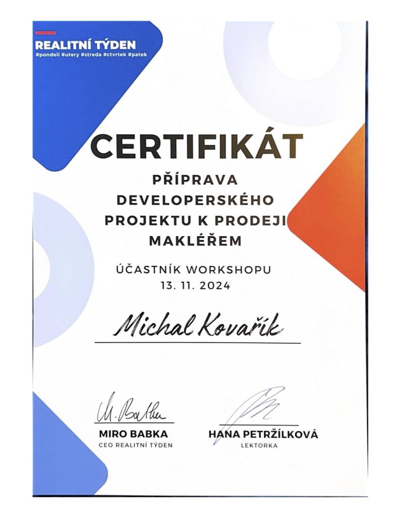 Velmi děkuji za výjimečný a profesionální přístup, pečlivost, znalost trhu a detailů a zodpovědnost. Pokud někdo potřebuje spolehlivého a zodpovědného profesionála v oblasti realit, vřele doporučuji Michala Kovaříka.