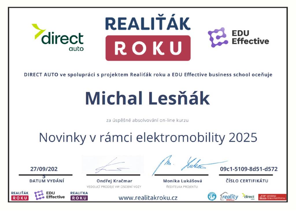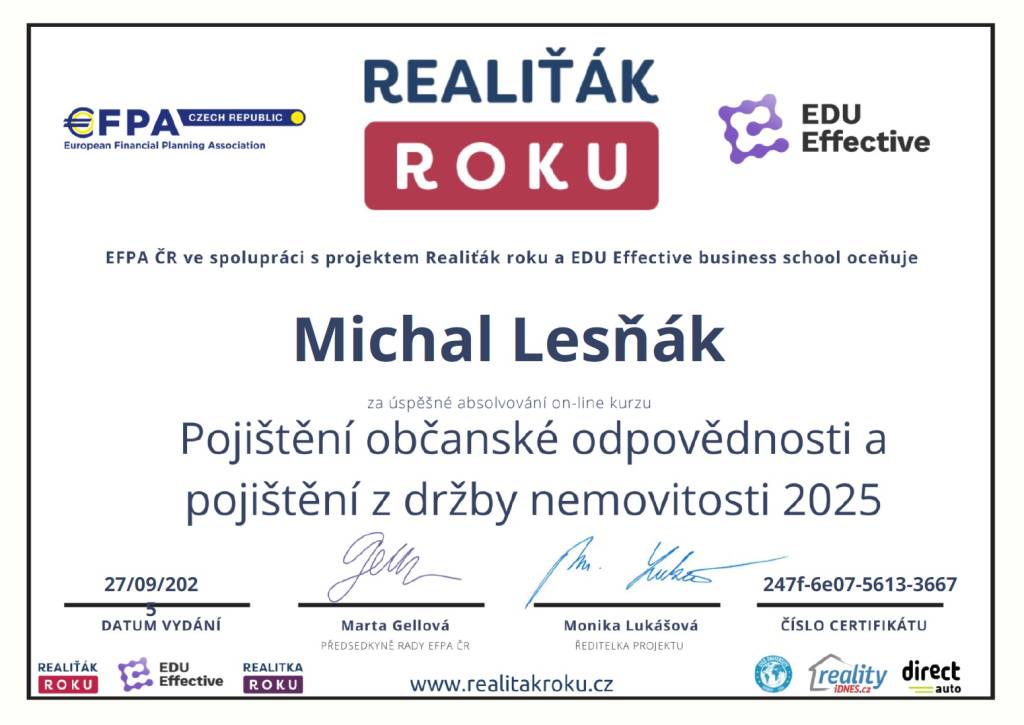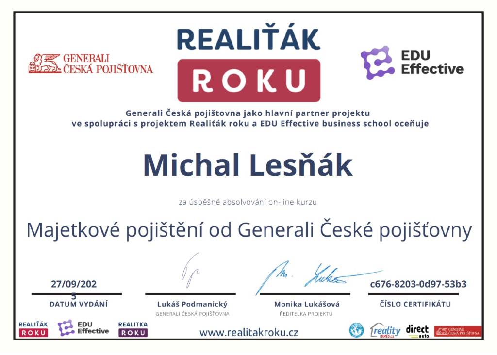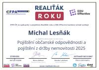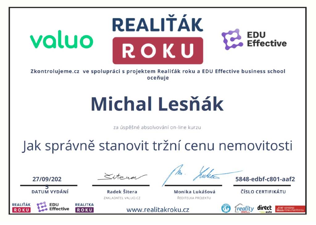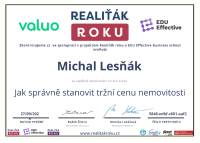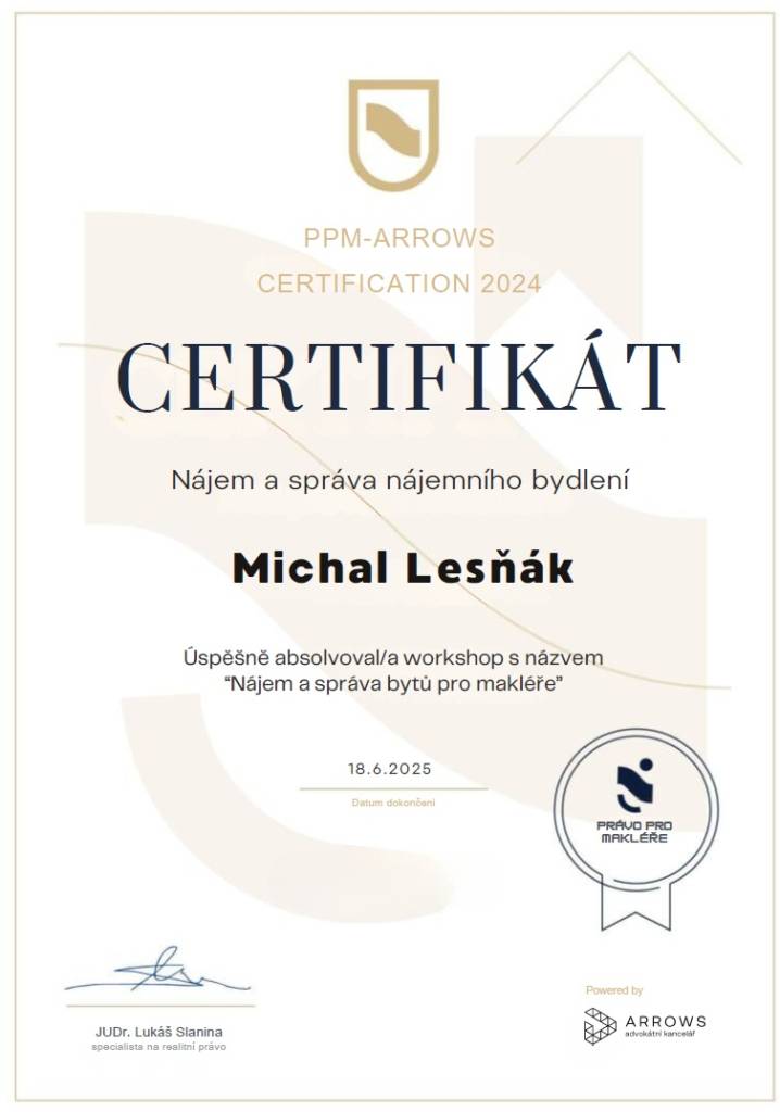 Pana Lesňáka, coby makléře, mohu vřele doporučit. Kvality jeho komplexně poskytovaných služeb spočívají zejména v připravenosti, vstřícnosti a přímočarosti, empatii, spolehlivosti, odbornosti a profesionalitě, v hladkém průběhu a dochvilnosti. Jednání s panem Lesňákem je navíc vždy velmi příjemné a sympatické.