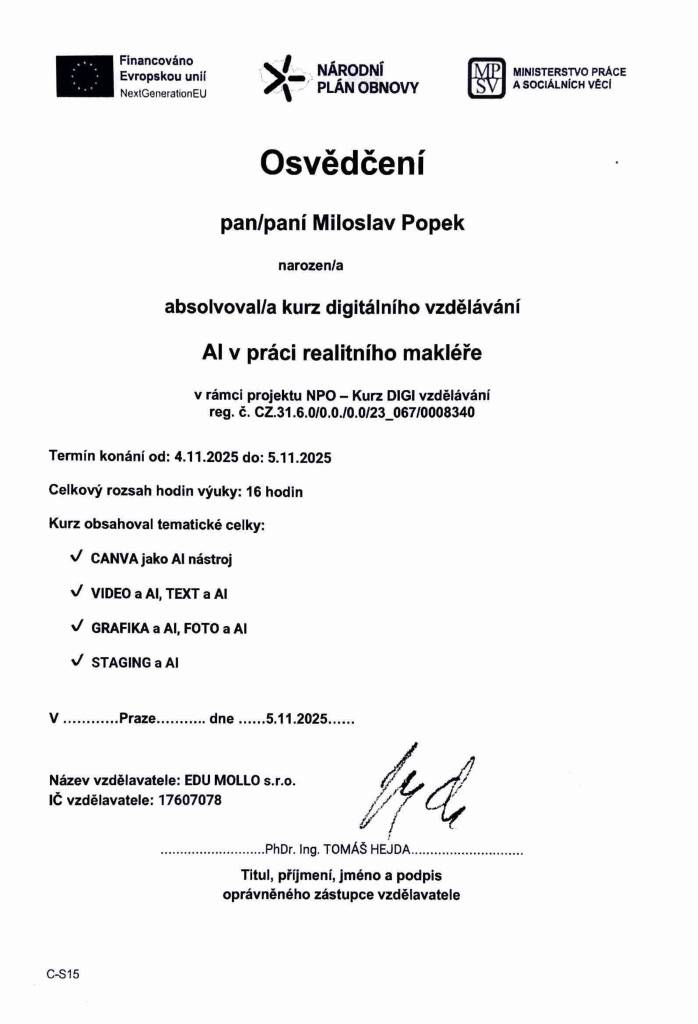 Na realitním makléři Mílovi Popkovi si nejvíc cením jeho nadšení pro realitní obor a snahy dělat věci jinak. Je vidět, že ho práce baví – má přirozený talent zaujmout, přinášet nápady a dělat i seriózní téma realit s lehkostí a humorem, který se krásně odráží i na jeho sociálních sítích.