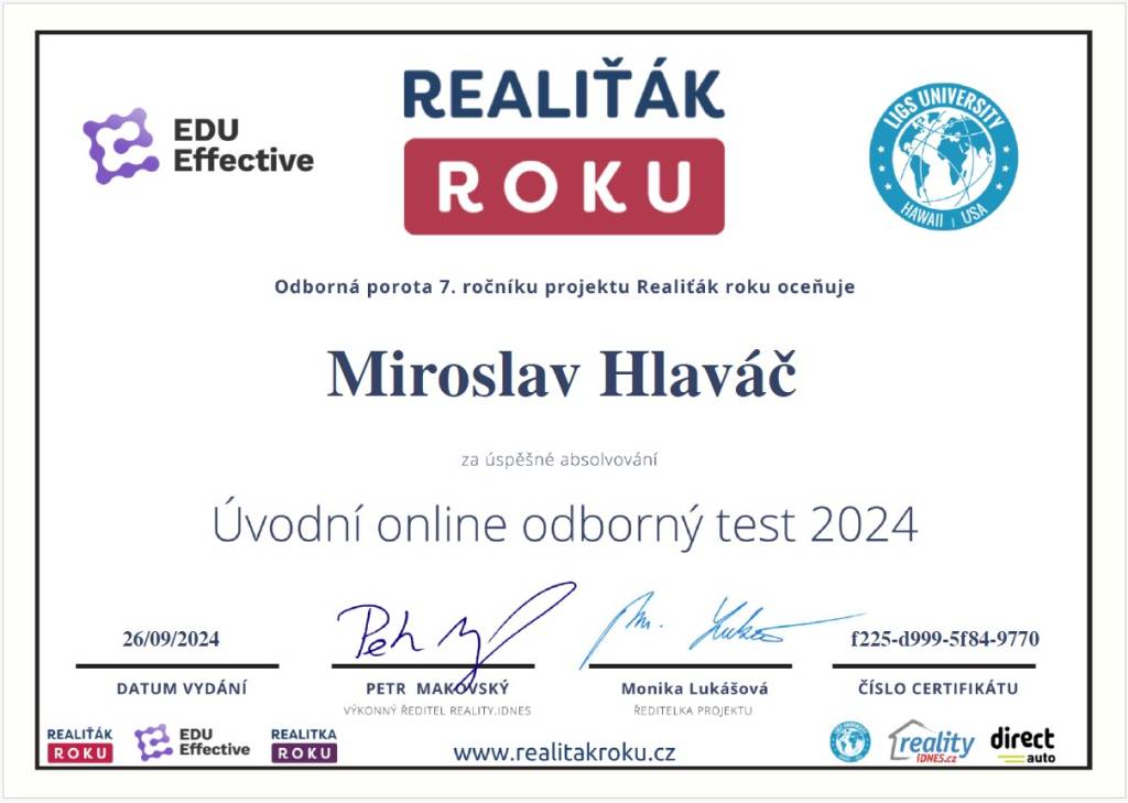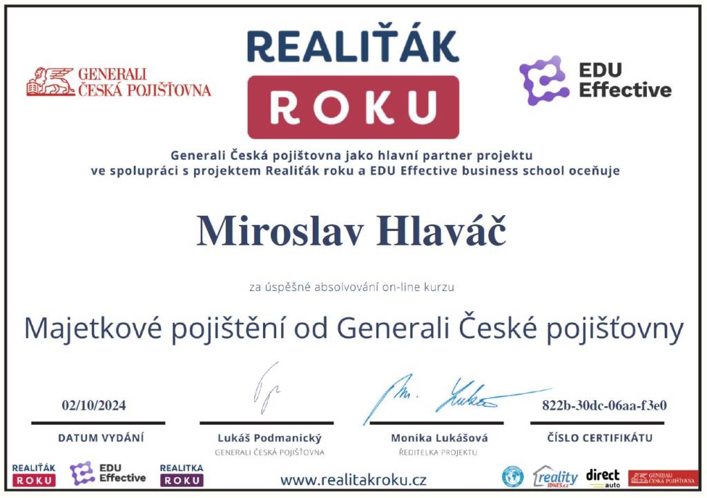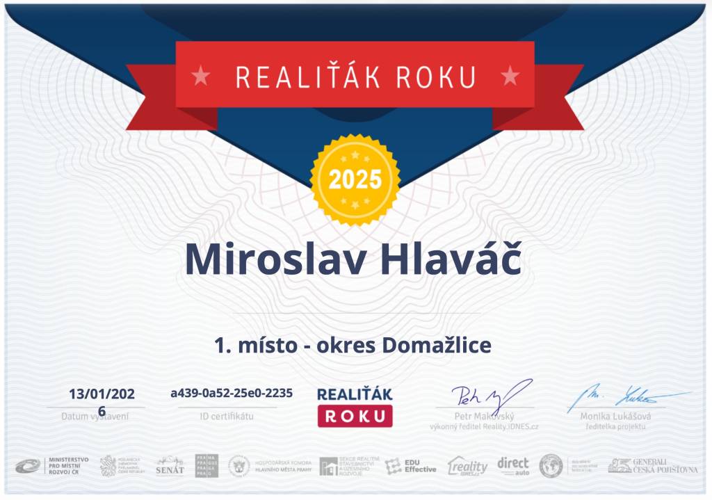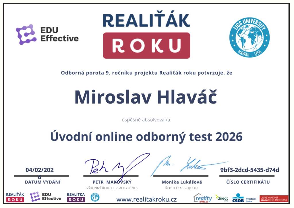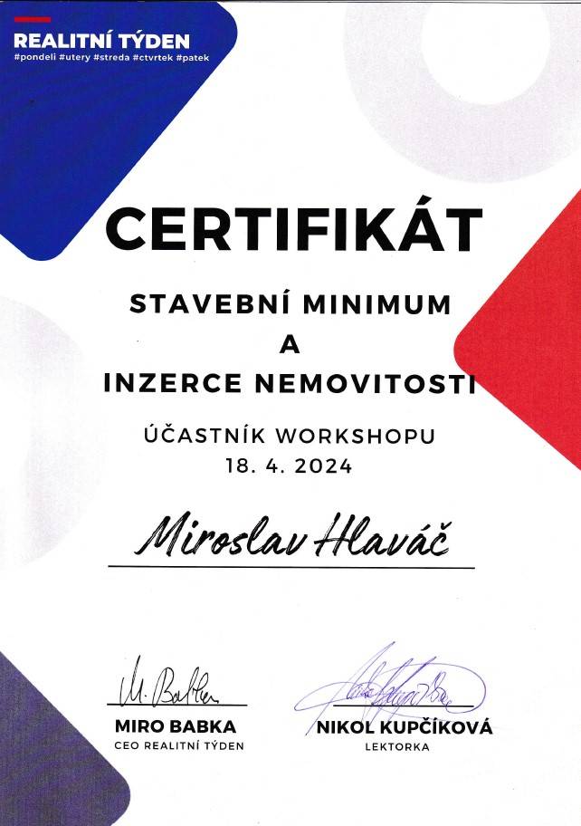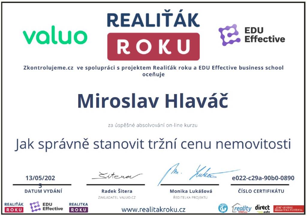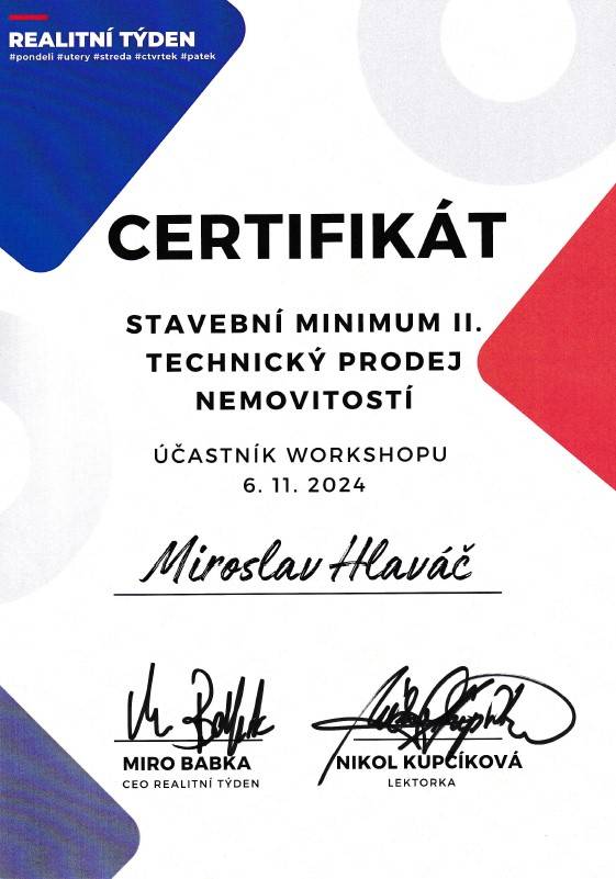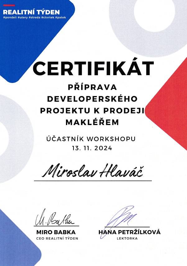Jmenuji se Miroslav Hlaváč, jsem certifikovaný realitní makléř a spolupracuji se společností TAURUM reality s.r.o. Mám za sebou kurz Czech Edu Academy zakončený odbornou zkouškou. Pomáhám svým klientům prodat jejich dům, byt nebo pozemek v okamžiku, kdy to klienti potřebují. Postarám se o to, aby vše proběhlo hladce, prodej se uskutečnil za co nejlepší možnou cenu a celý proces byl pro Vás příjemným zážitkem.