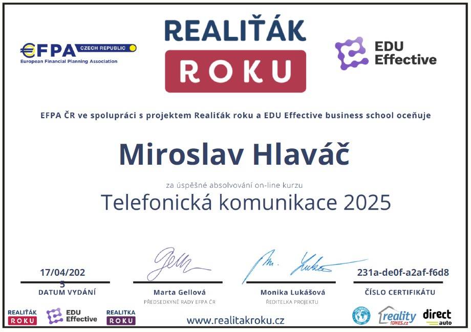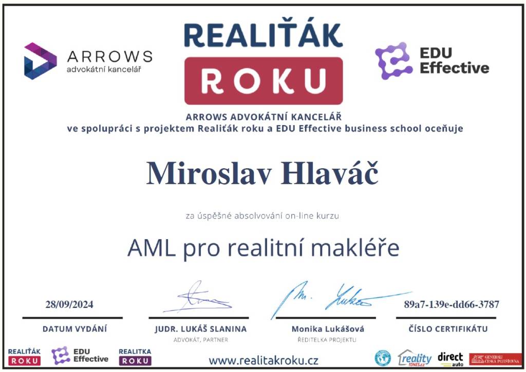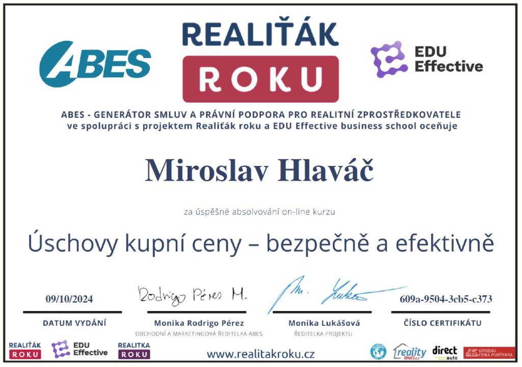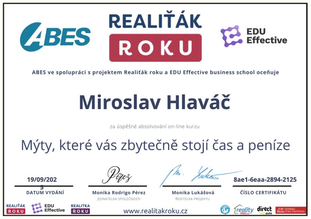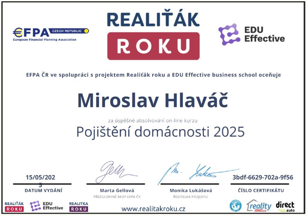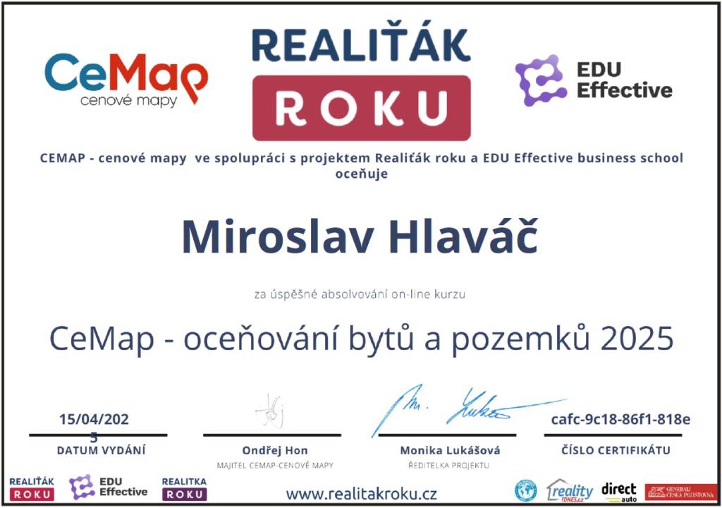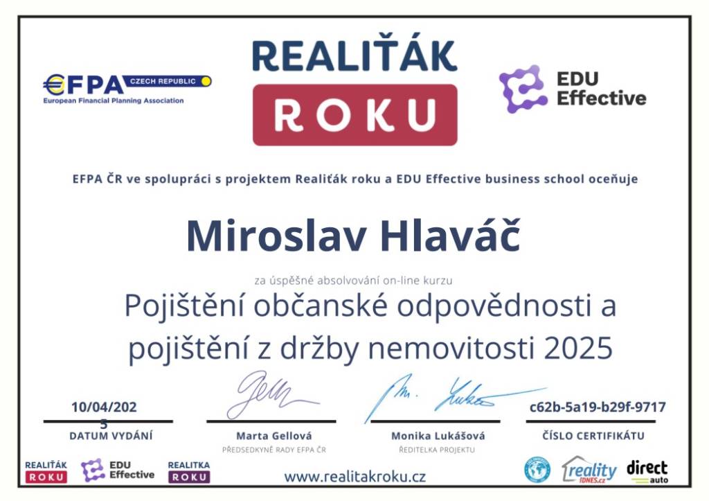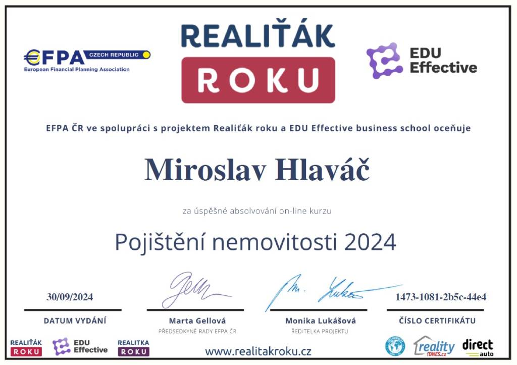Jmenuji se Miroslav Hlaváč, jsem certifikovaný realitní makléř a spolupracuji se společností TAURUM reality s.r.o. Mám za sebou kurz Czech Edu Academy zakončený odbornou zkouškou. Pomáhám svým klientům prodat jejich dům, byt nebo pozemek v okamžiku, kdy to klienti potřebují. Postarám se o to, aby vše proběhlo hladce, prodej se uskutečnil za co nejlepší možnou cenu a celý proces byl pro Vás příjemným zážitkem.