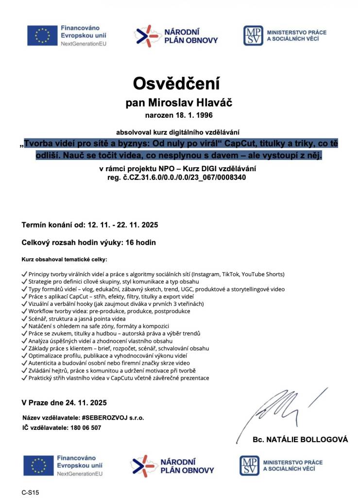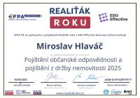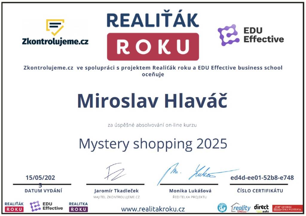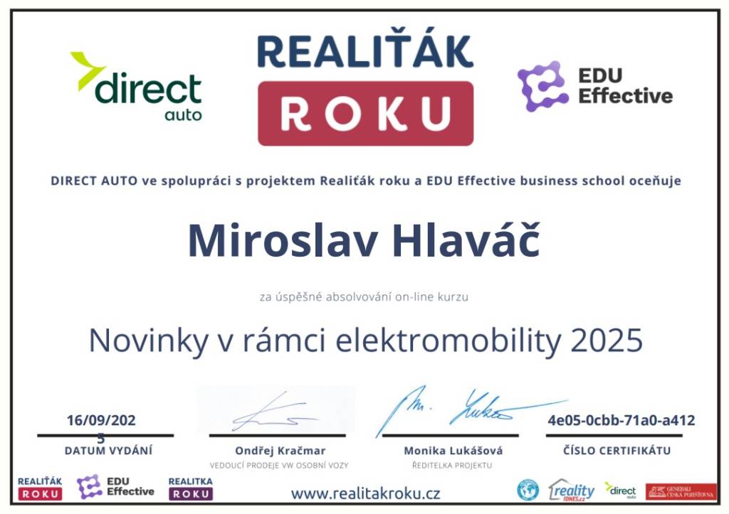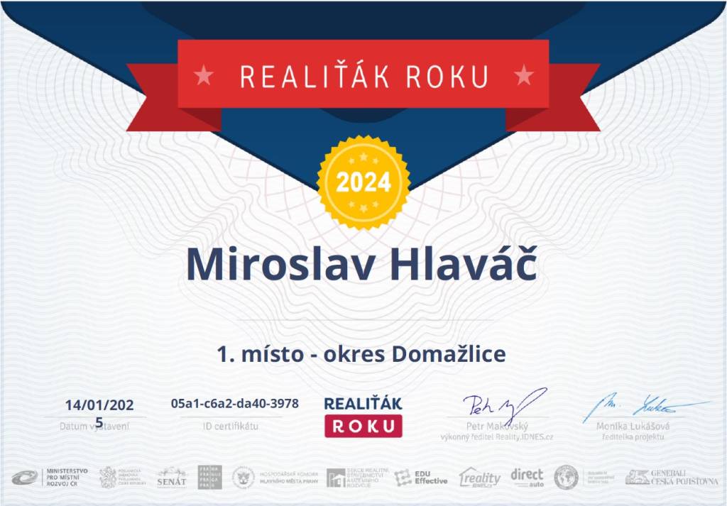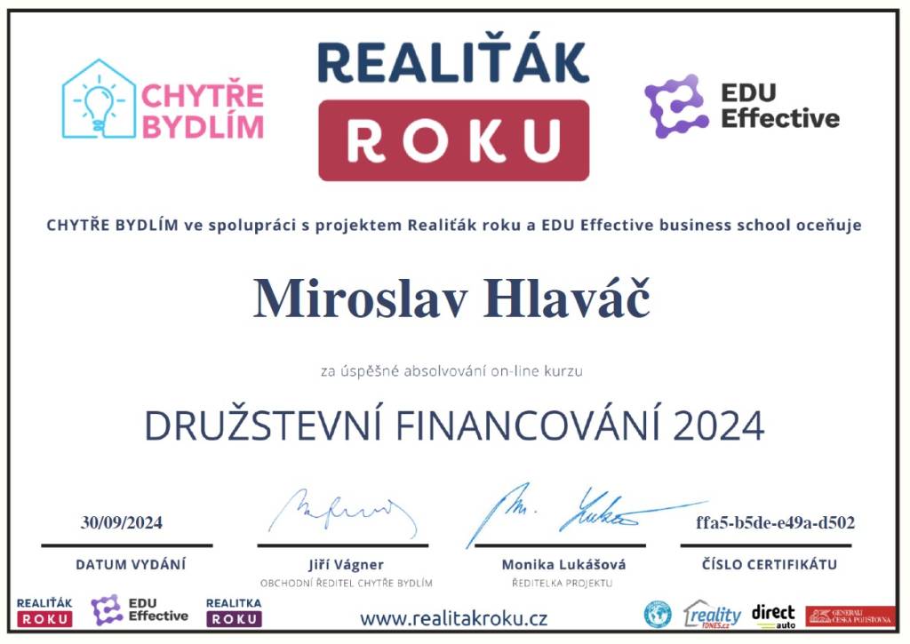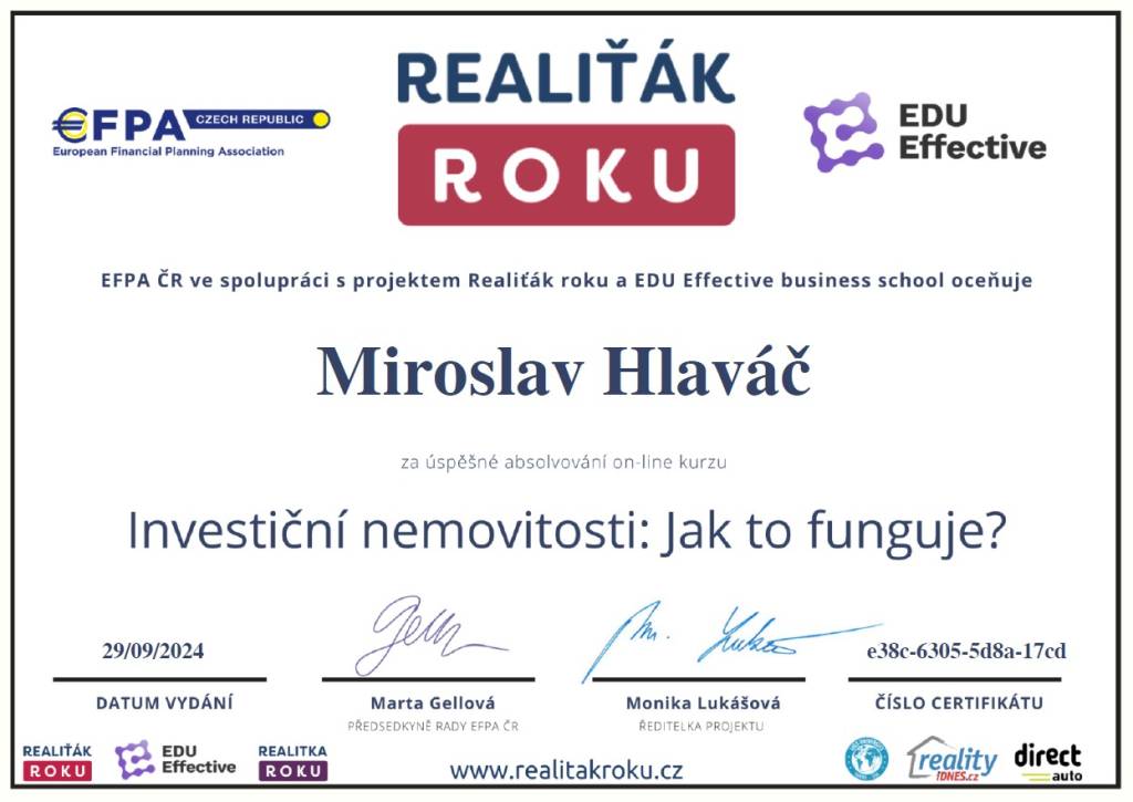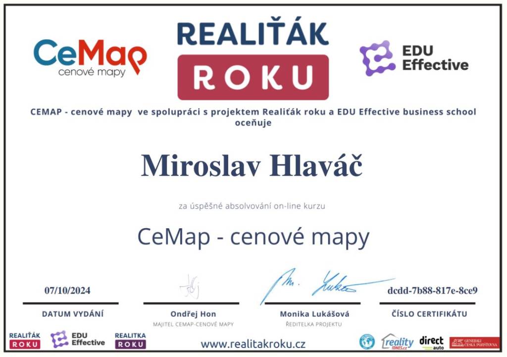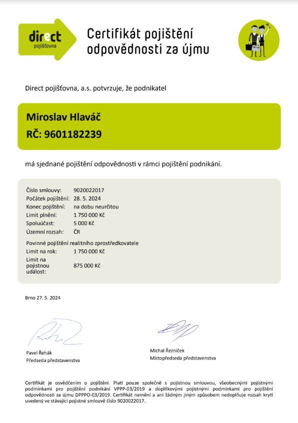 Jmenuji se Miroslav Hlaváč, jsem certifikovaný realitní makléř a spolupracuji se společností TAURUM reality s.r.o. Mám za sebou kurz Czech Edu Academy zakončený odbornou zkouškou. Pomáhám svým klientům prodat jejich dům, byt nebo pozemek v okamžiku, kdy to klienti potřebují. Postarám se o to, aby vše proběhlo hladce, prodej se uskutečnil za co nejlepší možnou cenu a celý proces byl pro Vás příjemným zážitkem.