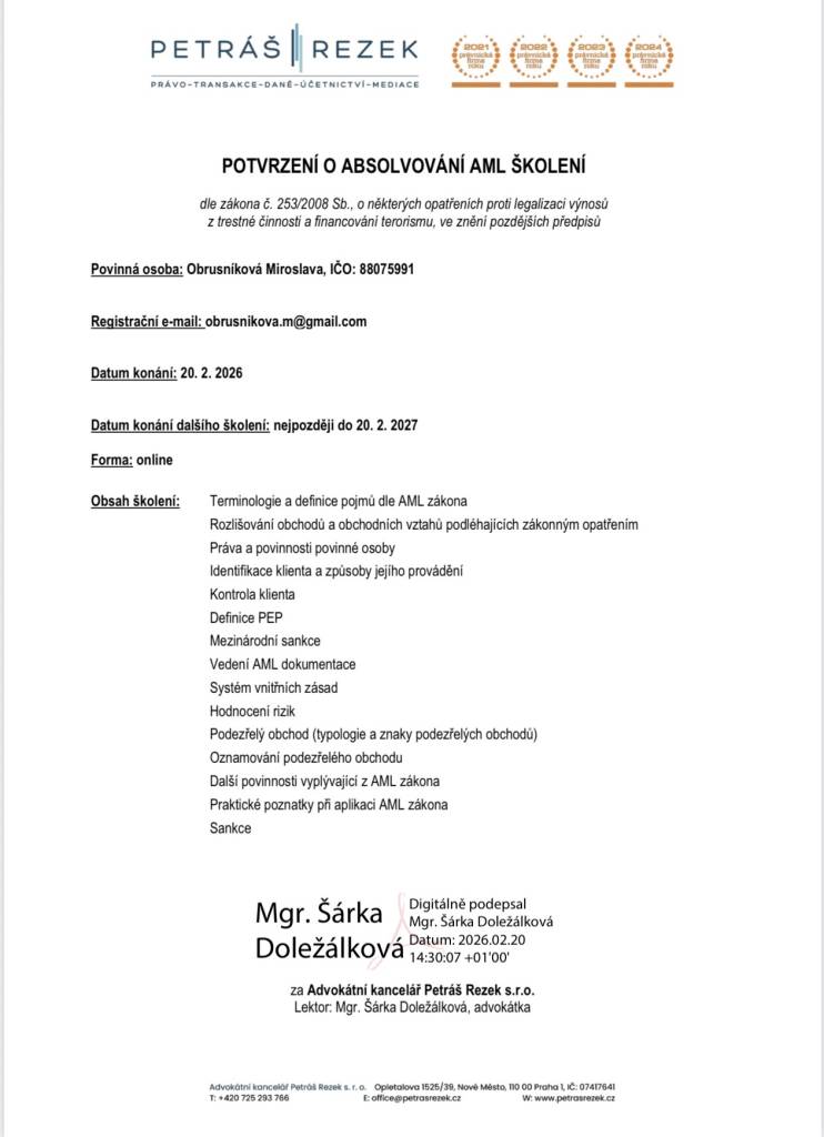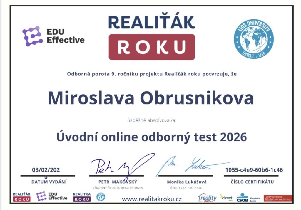 Rád bych touto cestou poděkoval paní Miroslavě Obrusníkové za profesionální přístup při zajištění pronájmu mé nemovitosti. Celý proces proběhl velmi rychle, přehledně a bez starostí. Paní Obrusníková zajistila veškerý servis – od prezentace bytu, přes výběr vhodného nájemce, přípravu smluv, předání bytu a přepis energií.