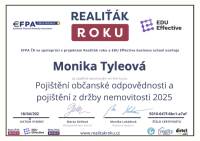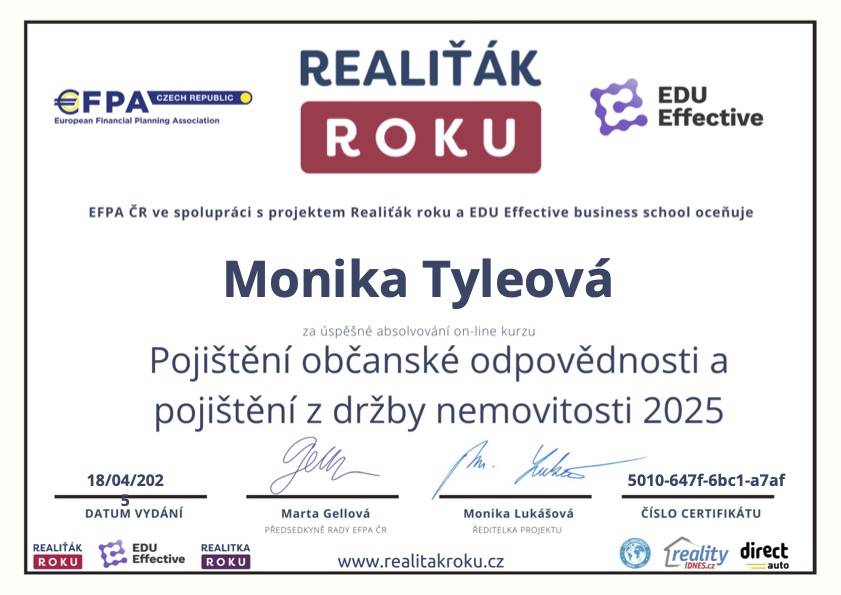 "Paní Tyleová je spolehlivá, empatická a korektní. Její práce se vyznačuje profesionálním přístupem, skvěle se ve svém oboru orientuje a dokáže nalézt optimální řešení pro obě smluvní strany. Děkujeme a paní makléřku doporučujeme."
