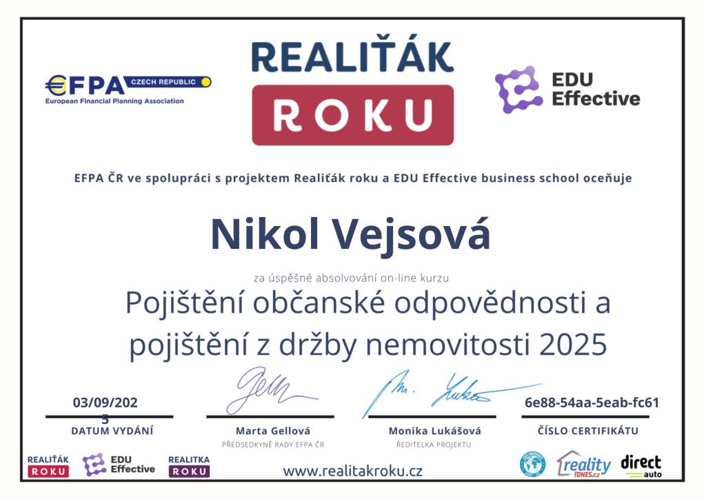 Mohu jen a jen chválit. Měla jsem možnost se setkat za svůj život s několika realitními makléři a mohu říct, že spolupráce s Nikol Vejsovou byla nejlepší. Dokázala zařídit nejen standartní věci, které bychom měli očekávat od každého realitního makléře, ale hlavně se vždy ochotně nabízela pomoci v záležitostech, kterým jsem buď nerozuměla, nebo byly pro mě časově náročné. Kéž by bylo takovýchto lidí víc.