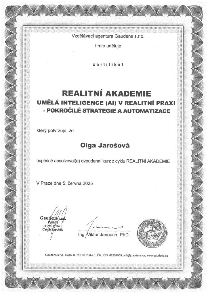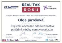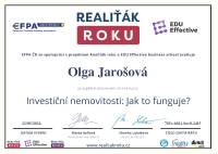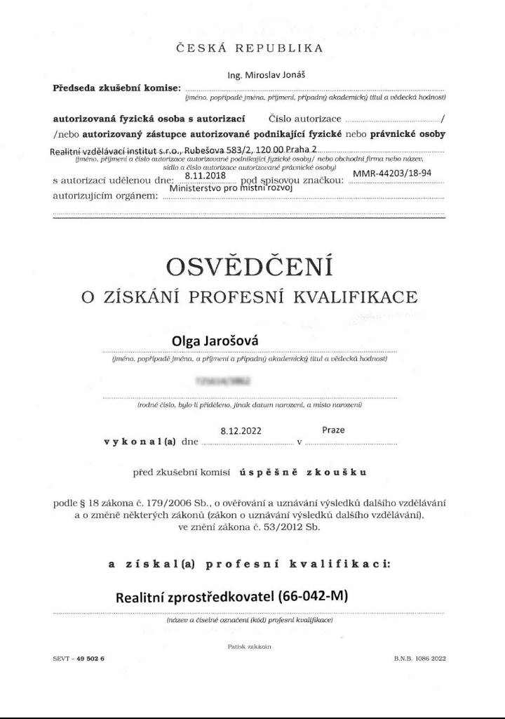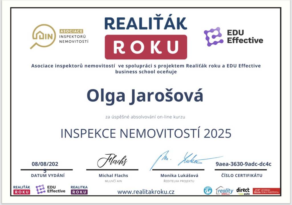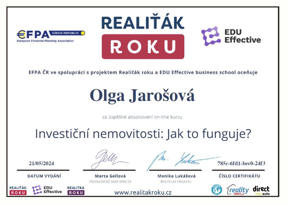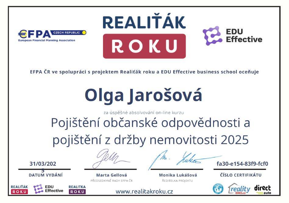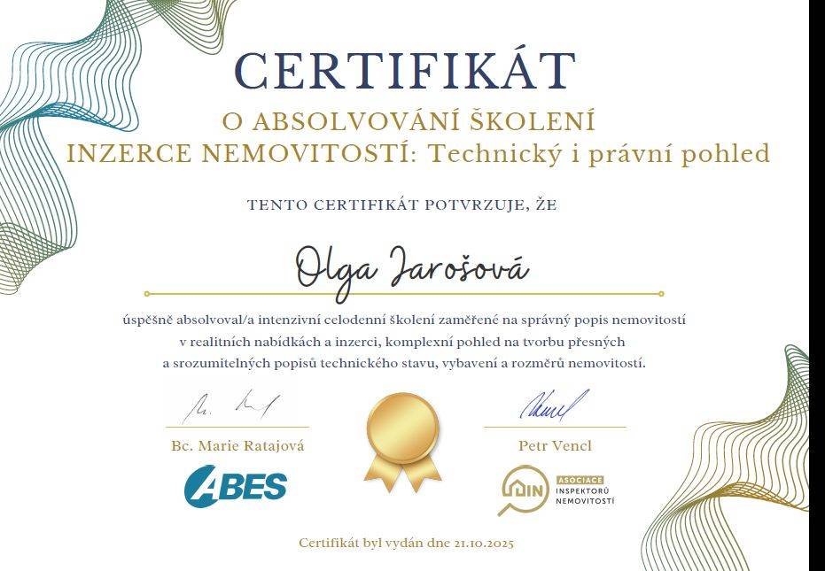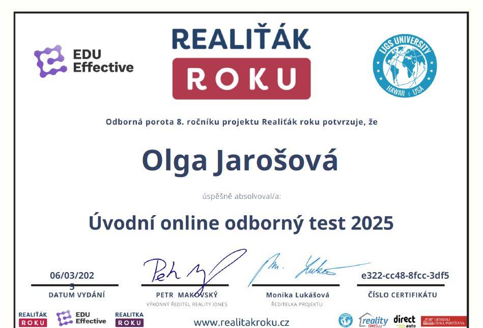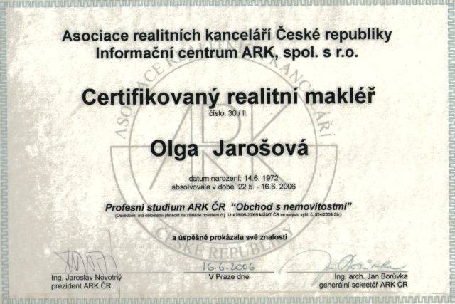Olgu Jarošovou znám spoustu let a je to vynikající makléřka i osobnost. Využila jsem její společnost v rámci nákupu realit a mohu všemi deseti doporučit její služby. Je to opravdový a fundovaný profesionál. Jana Krčálová