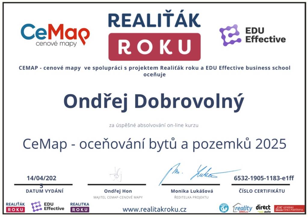 Jsem certifikovaný realitní specialista. Zaměřuji se na prodej a nemovitostí v Ústeckém kraji. Při realizaci svých zakázek dbám na kvalitní a moderní prezentaci s využitím novodobé techniky a postupů. Nabídka nemovitostí nemusí být jen na klasických inzertních serverech, a proto také pro své klienty řeším i marketing na sociálních sítích nebo přímo na plotě či lodžii jejich nemovitosti. Jedním z mých cílů je, aby byl klient po celou dobu obchodního případu řádně informován a cítil se tak bezpečně. Ke každé zakázce a každému klientovi přistupuji zcela individuálně, dle aktuálních potřeb. S kolegy, za které bych dal ruku do ohně, zajišťujeme kompletní právní servis, financování, přepis energií či stěhování a úklid nemovitostí. Klientům také poskytuji součinnost při řešení katastrálních nesouladů, vyhotovení PENB či vyrovnání jejich závazků vůči věřitelům. Mezi mé hodnoty patří profesionalita, spolehlivost, důvěra a osobní přístup. Mou motivací, je pozitivní hodnocení mých klientů.