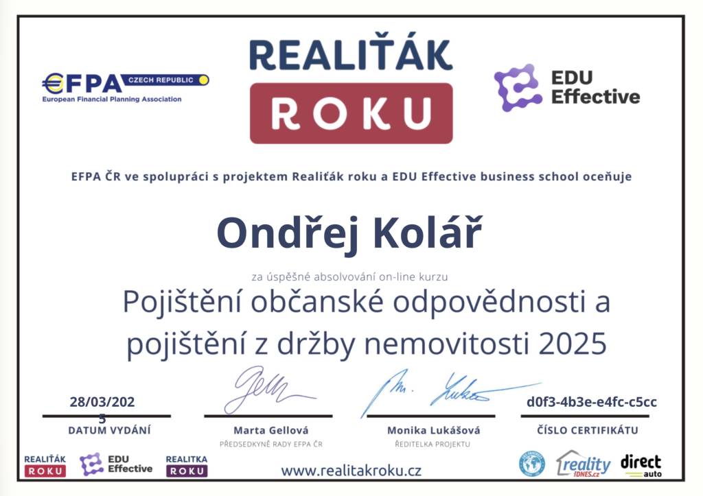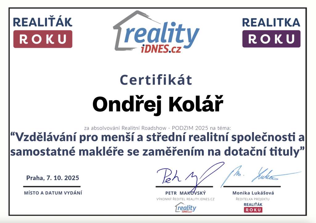 Jmenuji se Ondřej Kolář a v realitách se pohybuji od roku 2013. Svou práci miluju. Klient je pro mě důležitý, přistupuji k němu profesionálně a lidsky. Za každým prodejem nemovitosti se skrývá lidský příběh. Zbavím Vás zbytečných obav, starostí a stresů, a především zajistím bezpečný převod nemovitosti. Specializuji se na prodej a pronájem rodinných domů, bytů a pozemků na Orlickoústecku a Svitavsku, kde jsem vyrůstal, kde bydlím a kde to znám. Využívám moderní nástroje (virtuální prohlídky, videoprohlídky, letecké snímky dronem) a sociální sítě (facebook, instagram, youtube). Za svou praxi jsem pomohl již více než stovce klientů splnit si svůj sen o bydlení. Vždy mi záleží na odvedení stoprocentní práce a na spokojenosti klientů. Za mě pak hovoří reference mých spokojených klientů.