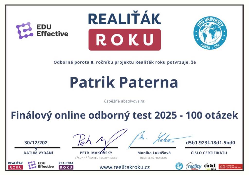 Služby realitní kanceláře, zvláště jednání pana Bc. Patrika Paterny bylo profesionální. Vřele doporučuji všem budoucím zákazníkům. Za mne absolutní spokojenost. Děkuji.