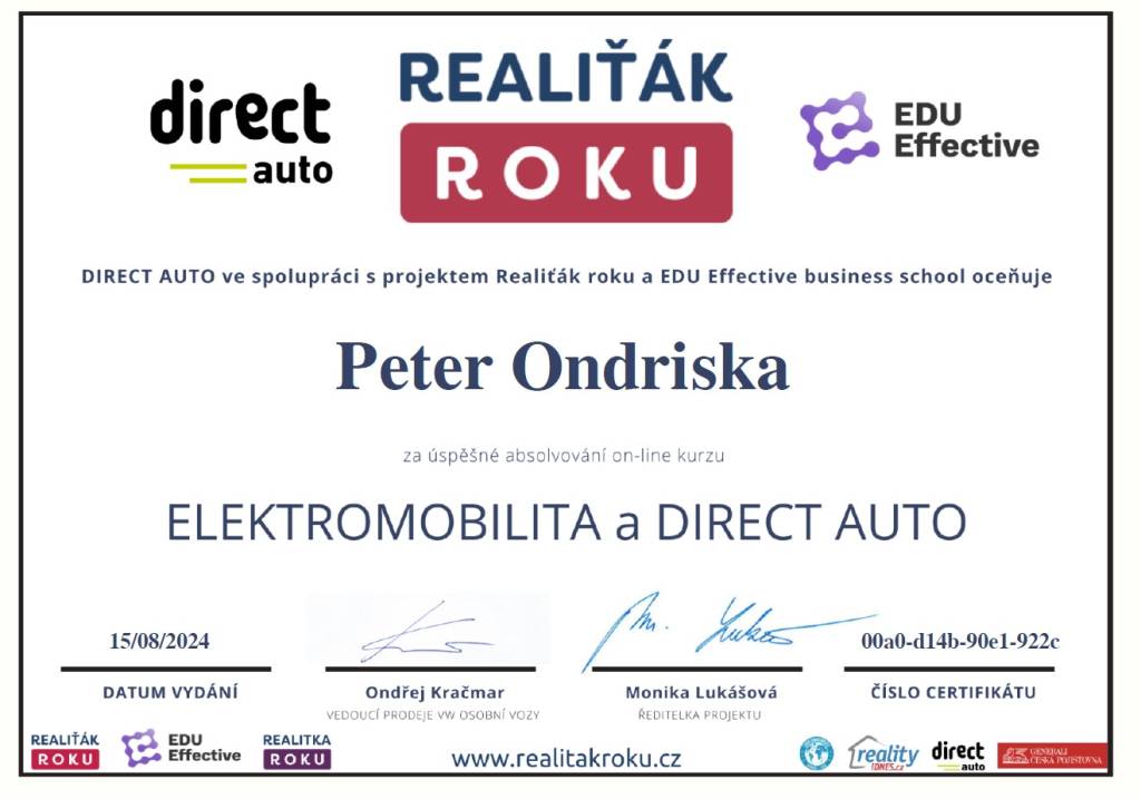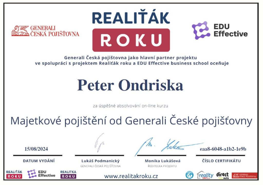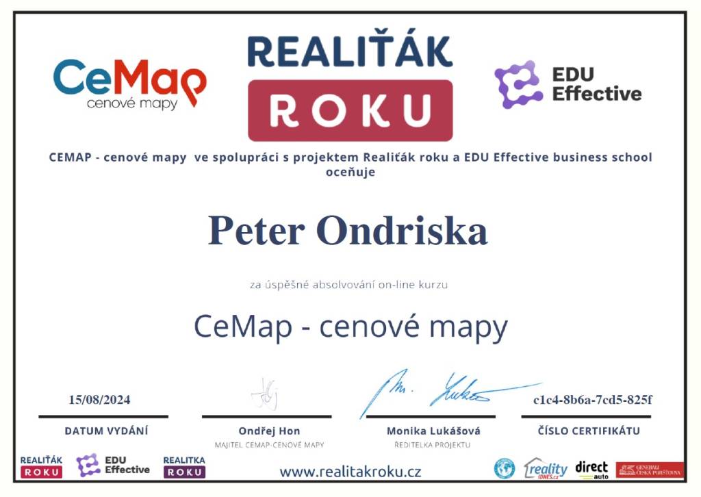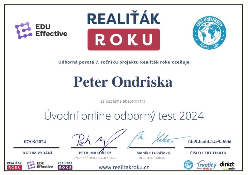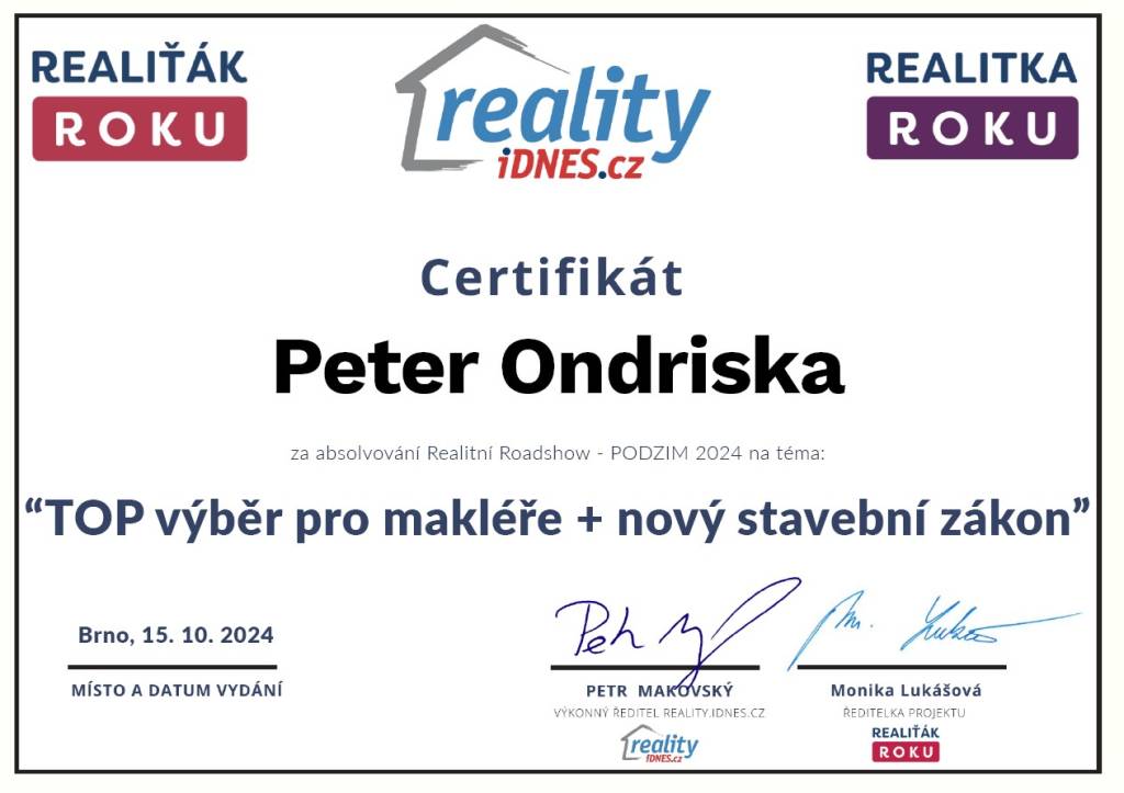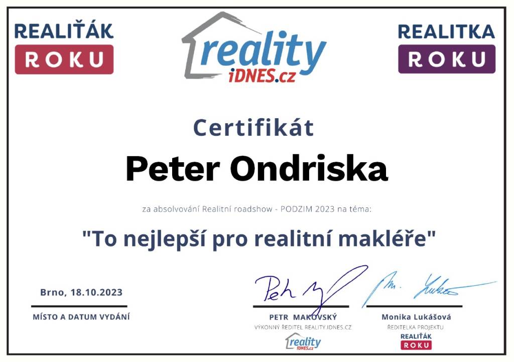 „Realitni kancelář pana Petera Ondríska hodnotím po všech stránkách velmi kladně. Od prvního našeho setkání se choval nejen jako profesionál, ale jako člověk vnímající problémy prodávajícího. Po celou dobu naší spolupráce se choval slušně, s pochopením a vstřícně. A to - zvláště v dnešní komerční době - není tak běžné. Mé hodnocení je proto maximálně kladné!“