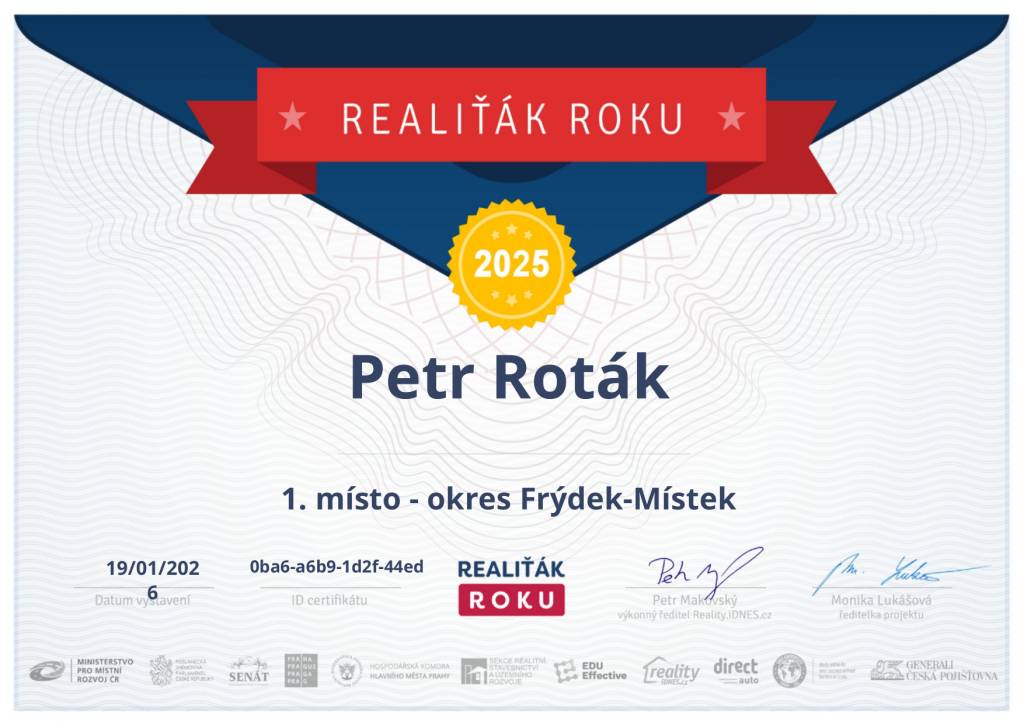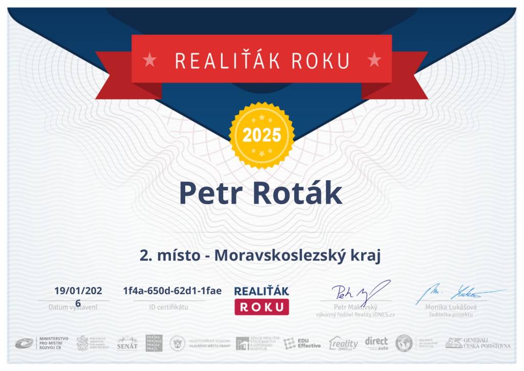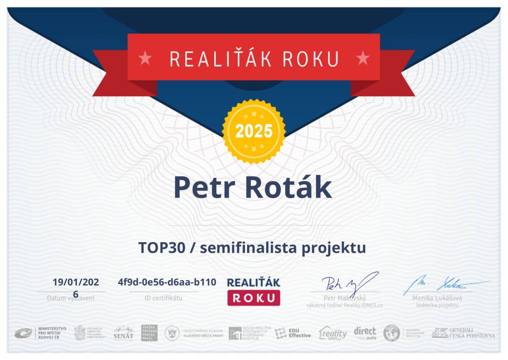 Na Petrovi Rotákovi si cením jedné věci úplně nejvíc – je nejen skvělý makléř, ale hlavně poctivý chlap. Co řekne, to platí. Žádné výmluvy, žádné kličky.Je neuvěřitelně systematický, má ve všem řád a tah na branku. A přesto – když ho poznáte blíž – zjistíte, že je velmi vřelý, přátelský a lidský. Pokud vám záleží na tom, komu svěříte prodej svého domu nebo bytu, s Petrem se můžete spolehnout na jednu věc: postará se o všechno od A do Z, s maximálním respektem k vám i k vaší nemovitosti.