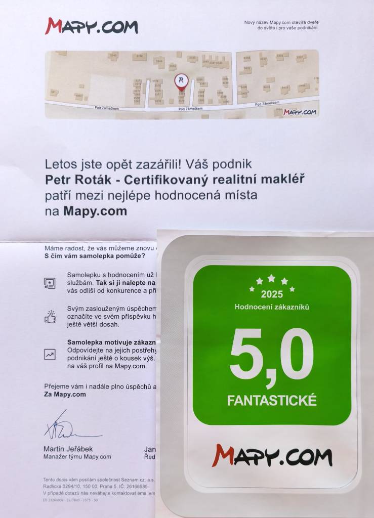 „Velmi rychlé jednání při prodeji nemovistosti, skvělá prezentace nemovitosti na internetu. Pan Roták byl vždy perfektně připraven, dodal nám všechny potřebné infomace jaké dokumenty, plné moci atd. třeba mít k prodeji. Jsem naprosto spokojen s jeho službami. Doporučuji ostatním.“