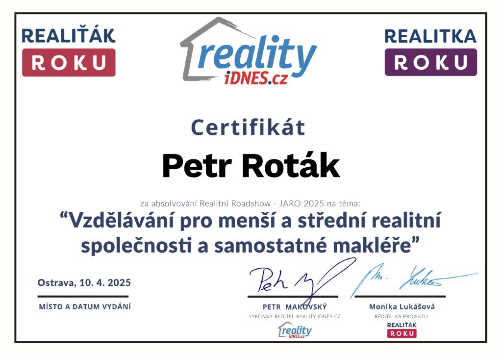 Díky profesionálnímu a obětavému přístupu Petra Rotáka byla celá záležitost s prodejem nemovitosti vyřešena poměrně rychle a bez problémů. Děkuji.
