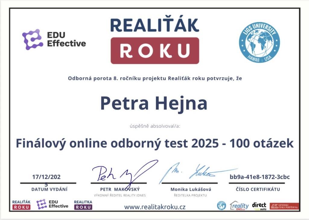 Chtěl bych srdečně poděkovat realitní makléřce Petře a finanční poradkyni Krystýně za jejich skvělou práci při pomoci s koupí mé vysněné nemovitosti. Petra byla neuvěřitelně profesionální, vždy k dispozici a díky jejímu přístupu proběhlo celé jednání rychle a bez stresu. Byla ochotná zodpovědět všechny mé otázky a zajistila, že každý detail byl vyřešen k mé maximální spokojenosti.