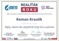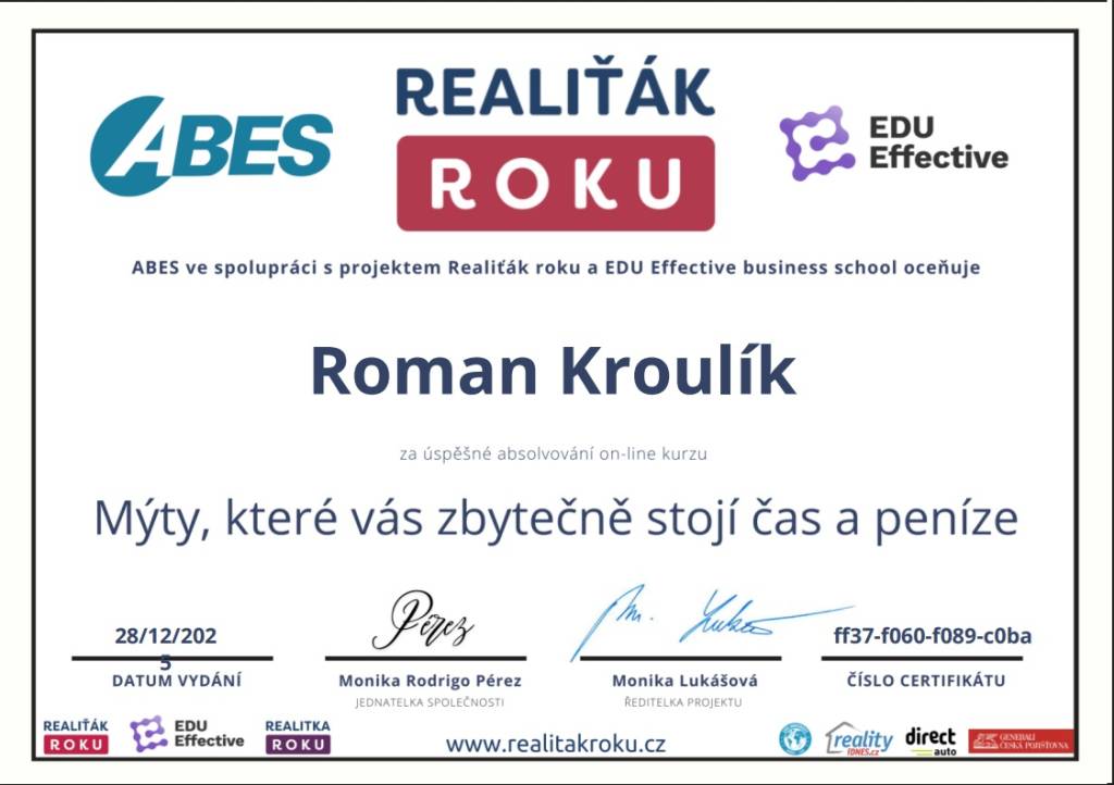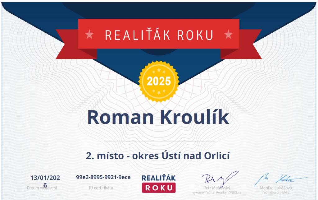 Jmenuji se Roman Kroulík a jsem Váš realitní makléř. Mým hlavním mottem vždy bylo: Co řeknu, to platí, co slíbím, to splním. Protože bez důvěry a spolehlivosti to prostě nejde. Jsem váš styčný důstojník a profesionální průvodce, který v realitním procesu najde vždy to nejlepší řešení. Má cesta v oblasti bydlení započala už v roce 2006, kdy jsem klientům plnil sny primárně skrze financování. Tyto téměř dvě dekády zkušeností s celým pozadím obchodu mi dnes dávají naprosto unikátní rozhled. Jako realitní makléř působím od roku 2023, ale má píle a důraz na dodržení slova mi umožnily ve velmi krátké době vystoupat mezi špičku v regionu. Naše realitní kancelář REALIT SPEKTRUM s.r.o. klade důraz na moderní technologie – uvědomujeme si, že držet krok s dobou je klíčové. Naše vize je ale ještě ambicióznější: být o krok vpřed. To znamená využívat inovace k tomu, aby vše proběhlo rychleji, efektivněji a s maximální transparentností a spokojeností všech zúčastněných stran. Tak ruku na to!