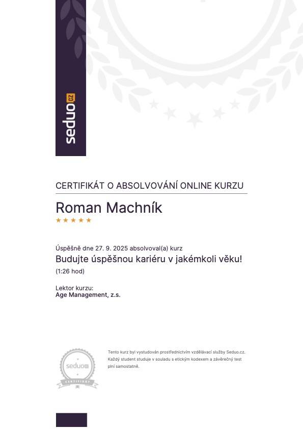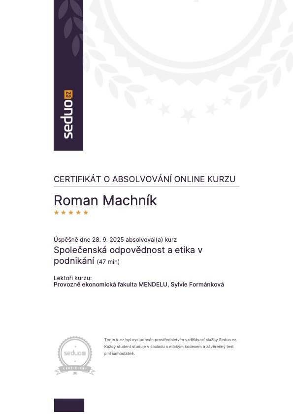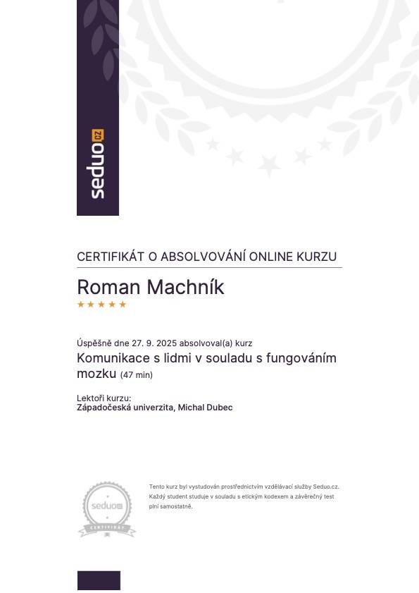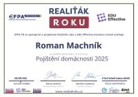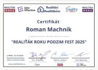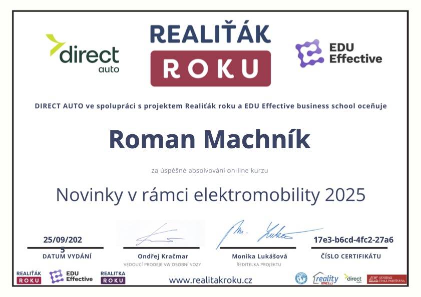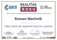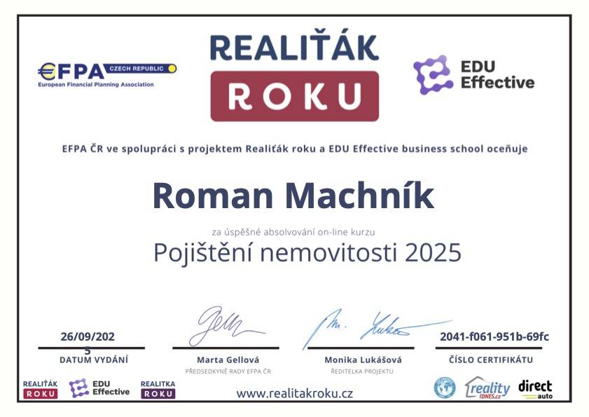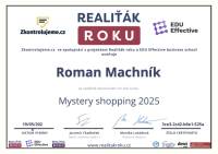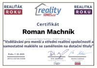 Pan Machník je profesionál po všech stránkách. Není to ale ona chladná neosobní profesionalita, ale naopak vstřícné, lidské a milé jednání, kde má navrch empatie, spolehlivost a klid. Nakonec náš obchodní vztah makléř - klient přerostl do jiné, nové a troufám si říct zajímavější roviny, neboť právě společně s panem Machníkem připravujeme nový developerský projekt. Pokud bude vše klapat tak spolehlivě jako doposud, bude to zcela jistě projekt úspěšný. A moc se na naší další spolupráci těším. Je jisté, že pokud budu cokoliv řešit v oboru realit, pan Roman Machník bude zcela jistě u toho. Děkuji!