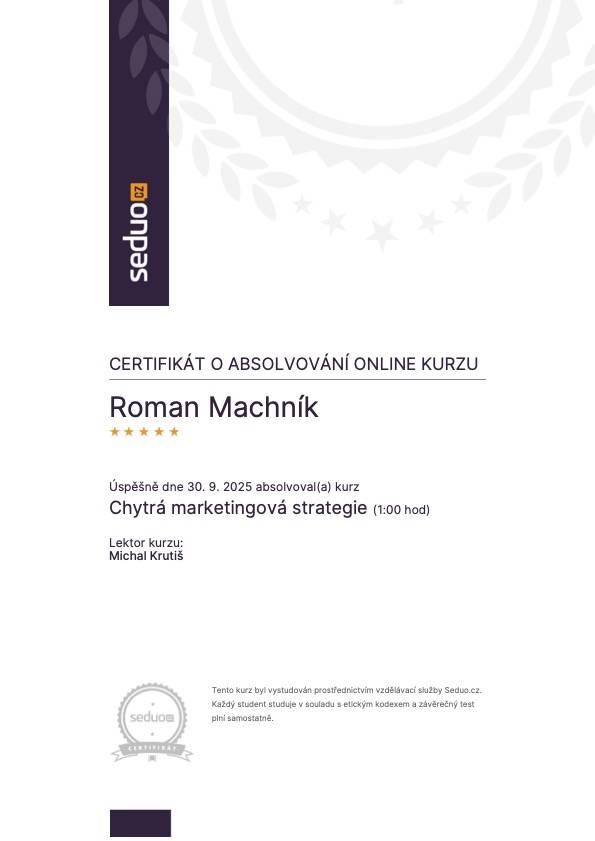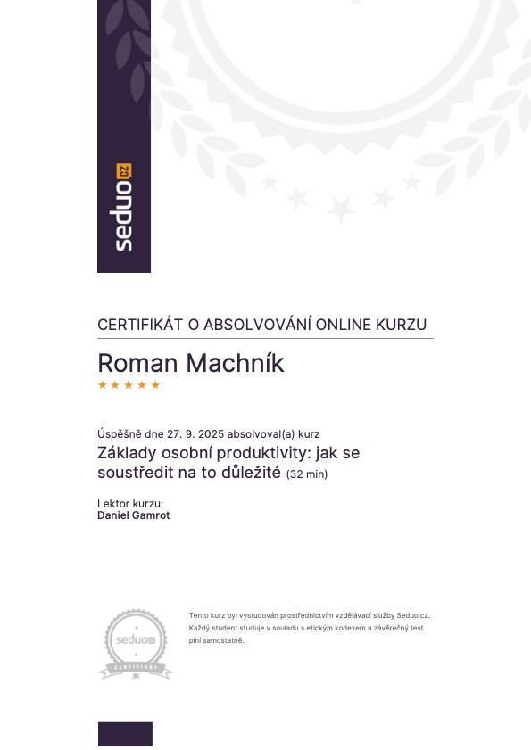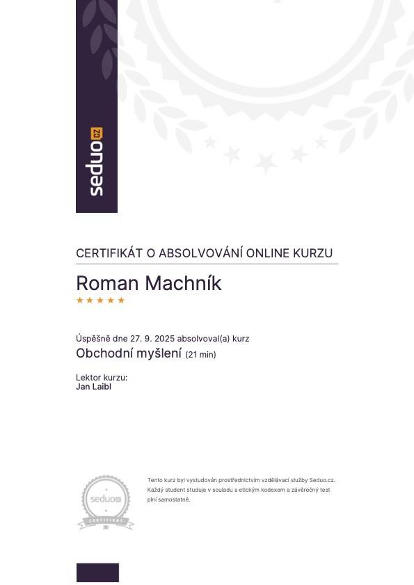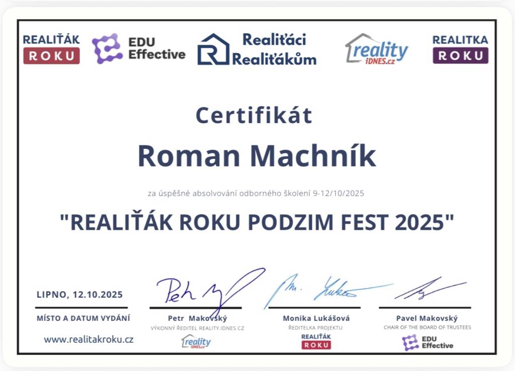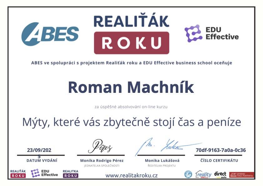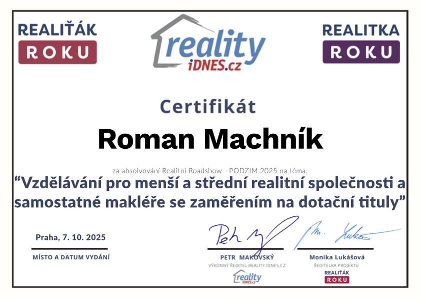 V kontaktech mám uloženo "Machr Roman". Proč? Protože je fakt dobrej: ví co dělá, proč to dělá a jak to má dělat, vše s maximální pečlivostí. Má vynikající vyjednávací schopnosti, profesionální přístup, orientaci na trhu, velmi dobře koordinovaný tým profesionálů. Stoprocentně byly dodrženy domluvené procesy, termíny plněny. Oceňuji otevřenou komunikaci - byla vždy pravdivá, srozumitelná a efektivní, jak směrem k nám jako prodávajícím, tak i vůči kupujícím. Jsem ráda, že partnerem při prodeji byl někdo, na koho jsem se mohla 100% spolehnout. Mohu ho s klidným svědomím doporučit každému, kdo hledá spolehlivého a profesionálního partnera v oblasti realit.