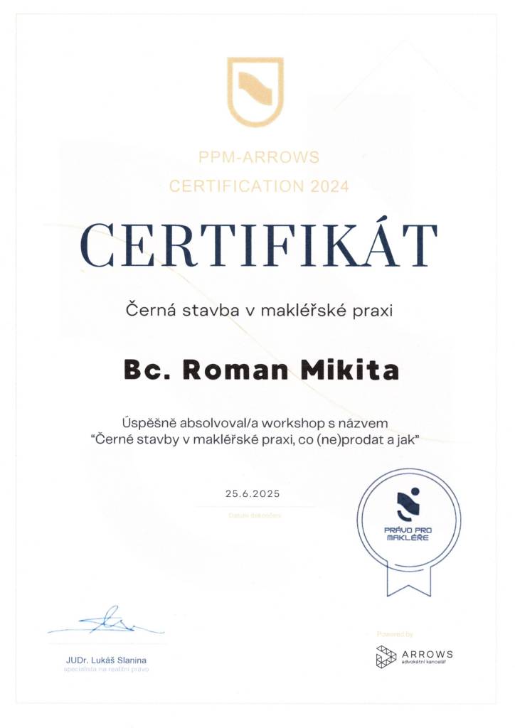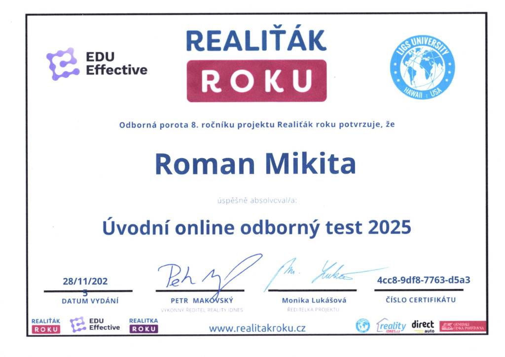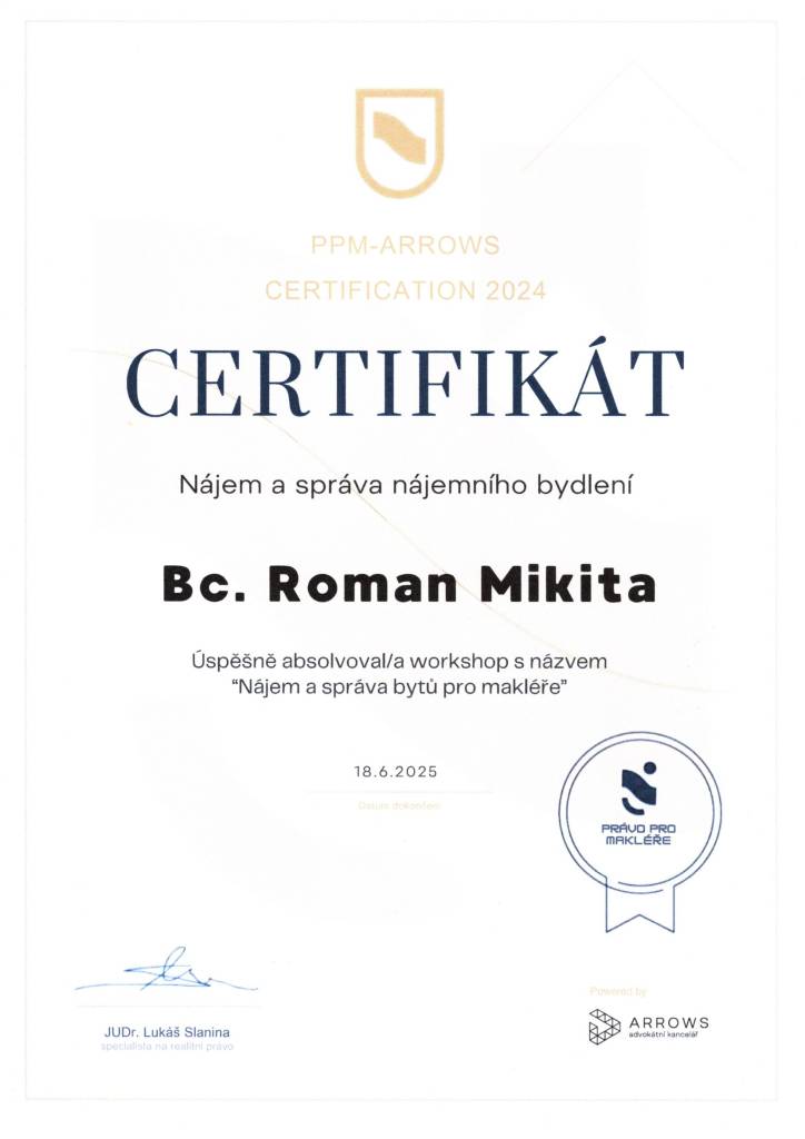 Chtěl bych touto cestou opětovně poděkovat Bc. Romanu Mikitovi za zprostředkování pronájmu bytu. Nové bydlení jsem hledal půl roku a setkal s nejrůznějšími lidmi, co se týče majitelů bytů i makléřů, a realitní trh jsem začal nazývat realitní džunglí bez jakýchkoli pravidel. S Bc. Romanem Mikitou jsem získal zcela novou zkušenost, neboť jeho seriózní a profesionální jednání bylo naprosto výjimečné. Pokud by kdokoli zvažoval spolupráci s Bc. Romanem Mikitou, mohu ji vřele doporučit.