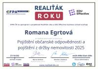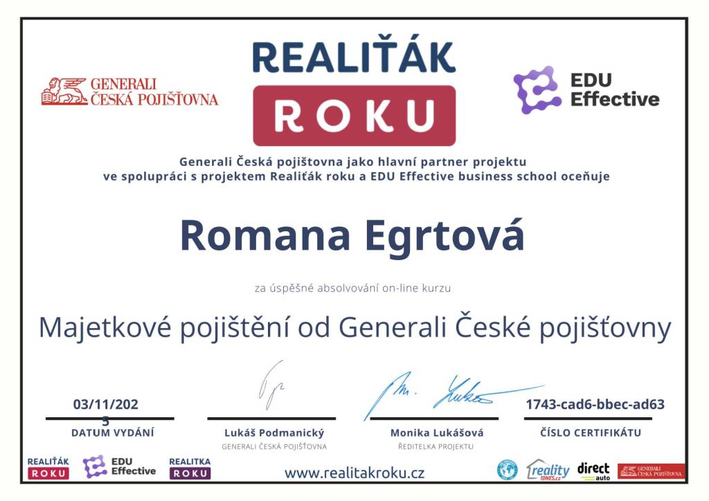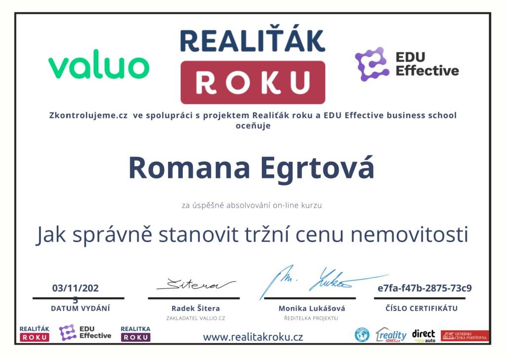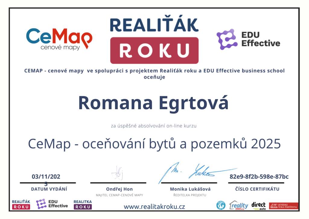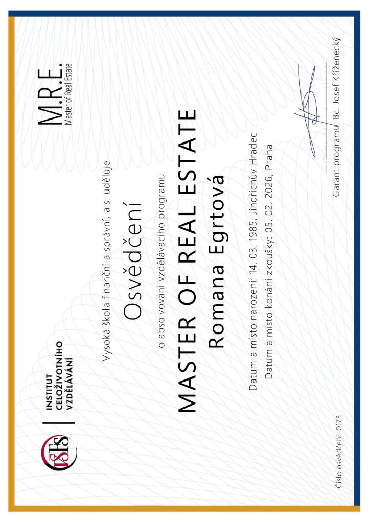 Jsem realitní makléřka, která spojuje profesionalitu, lidskost a cit pro detail. Každou nemovitost vnímá jako příběh – s atmosférou, potenciálem a emocí, které se promítají do mojí prezentace a prodeje. Pod značkou Reality Egrtovi pomáhám klientům naplnit jejich sny o bydlení.. Nejde mi jen o prodej, ale o férový a bezpečný proces, ve kterém se klient cítí jistě – od první prohlídky až po podpis na katastru. Díky zkušenostem s interiérovým designem a home-stagingem dokážu zvýraznit kouzlo každé nemovitosti tak, aby zaujala nejen racionálně, ale i emocionálně. Spolupracuji s partnery, právníky i finančními specialisty a dokážu propojit všechny kroky realitního procesu do jednoho hladkého celku.