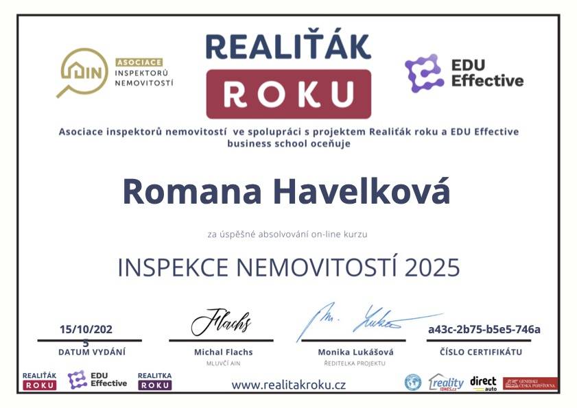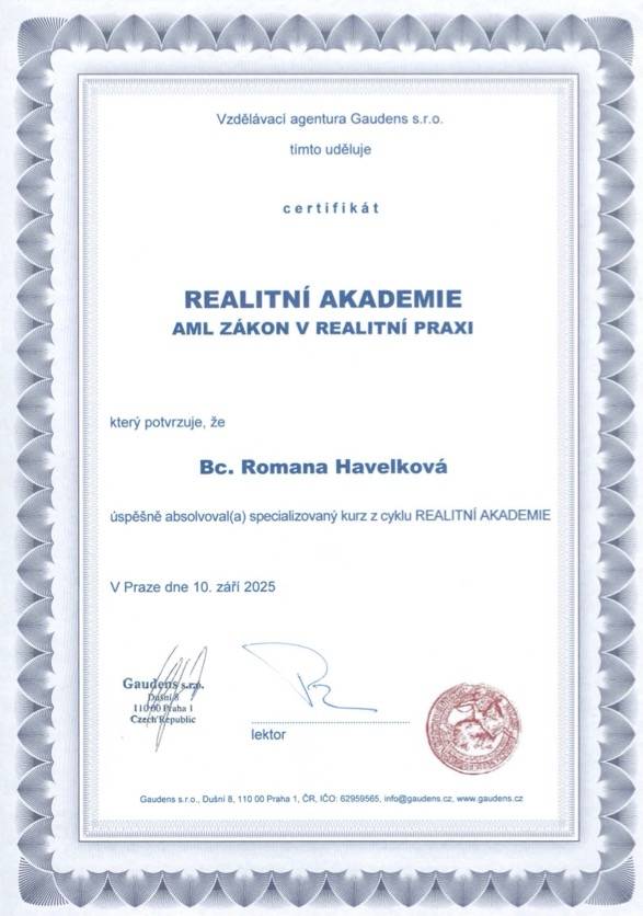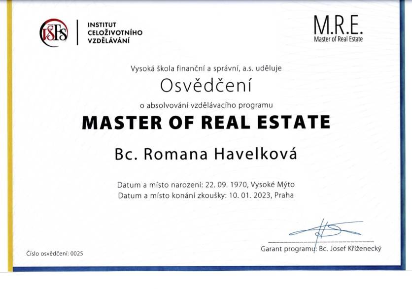 Nabízím své zkušenosti s prodejem nemovitostí po jedenácti letech práce v tomto oboru. Mé klienty provázím celým procesem počínaje analýzou aktuální situace na trhu vs. jejich konkrétních potřeb, nastavením na míru šité strategie prodeje, vyhledáním zájemce, až po zpracování všech potřebných právních úkonů. Většina mých zákazníků se rekrutuje z předchozích referencí. Profesionalitu beru jako samozřejmost, za stěžejní považuji vzájemnou důvěru. Jsem certifikovanou makléřkou Master of Real Estate (M.R.E.), mám sjednáno profesní pojištění odpovědnosti pro realitní makléře.