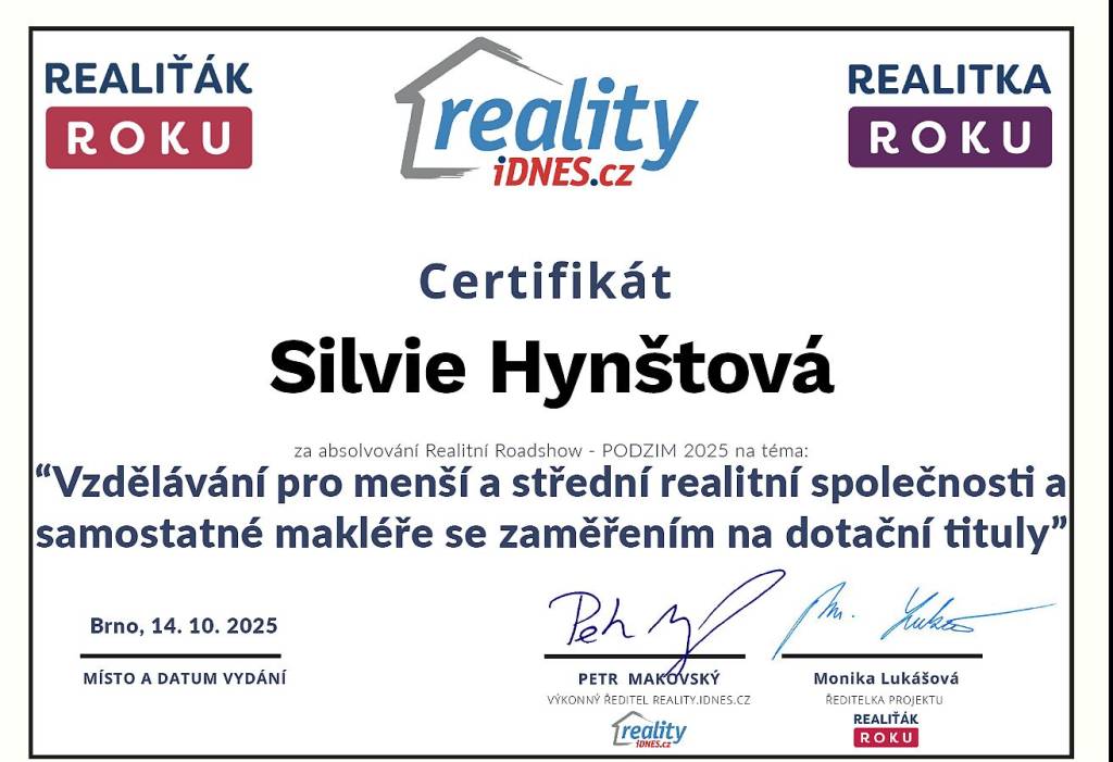 Reality Hynštová mohu jen doporučit. Byla jsem maximálně spokojená s prodejem nemovitosti.