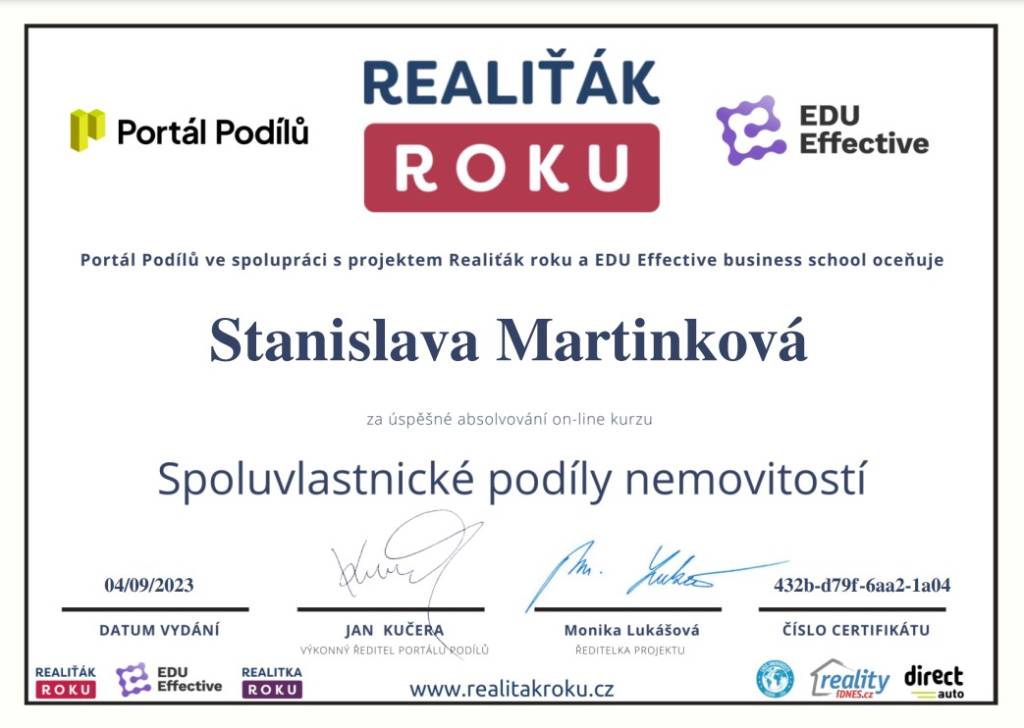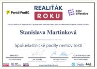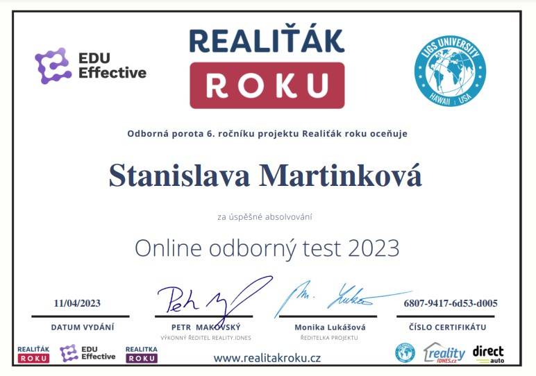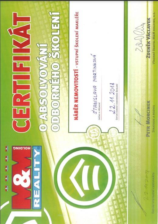 S makléřkou paní Stanislavou Martinkovou jsem velmi spokojena, spolupracujeme dlouhodobě. Snaží se sladit požadavky pronajímatele i zájemce o pronájem. Když se dohodneme na nějakém čase, tak vždy je dochvilná. Pokud má jednání či řídí auto a nemůže mi vzít telefon, tak se vždy pak sama ozve. (i po pracovní době). Při prohlídkách bytu jsem vždy přítomná, oceňuji, jakou má trpělivost se zájemci a vše podrobně jim vysvětluje. Bohužel, v současné době je velmi složité najít slušného a zároveň solventního klienta.