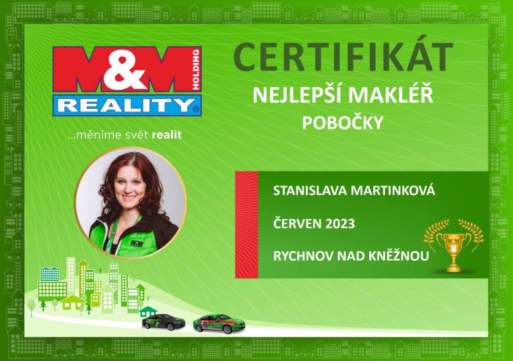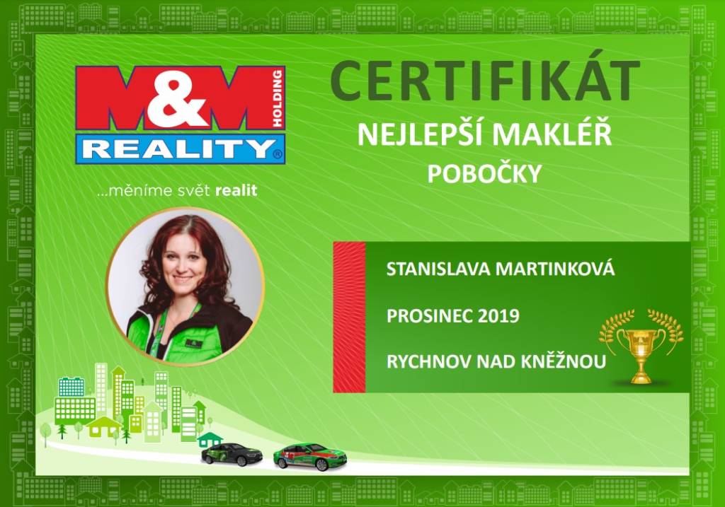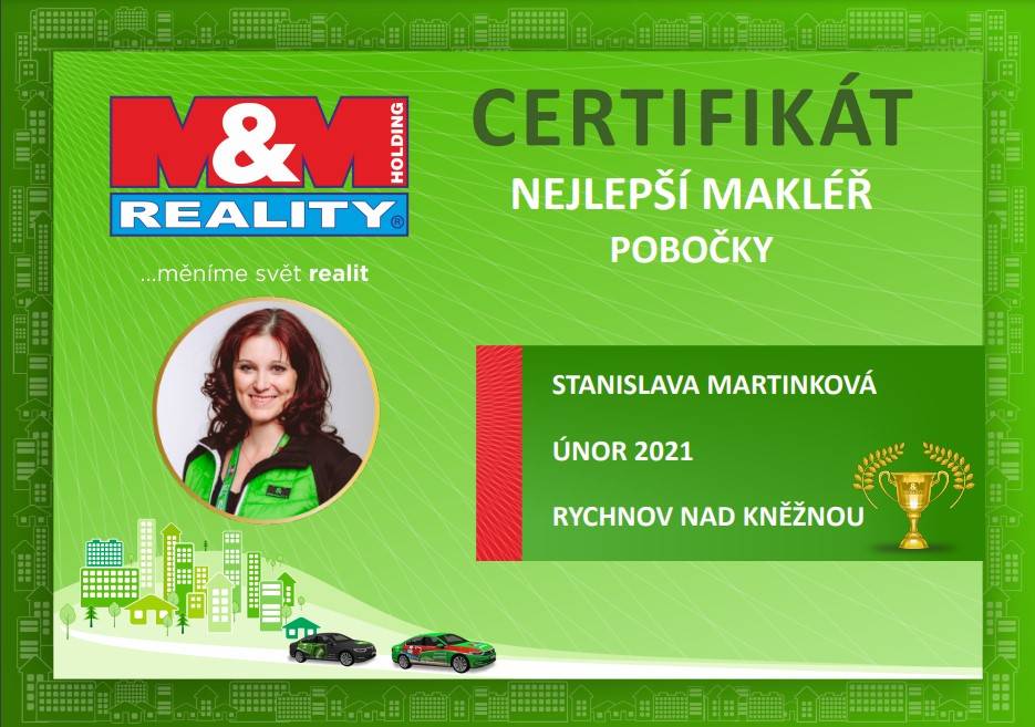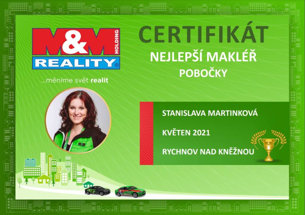 S makléřkou paní Stanislav Martinkovou jsem byla při průběhu koupě bytu v ul. Janáčkova v Rychnově nad Kněžnou velice spokojená. Přístup paní makléřky Martínkové se projevoval jak vysokou profesionalitou, tak velmi vstřícným přístupem a jednáním v zájmu klienta. Za toto jí velice děkuji.