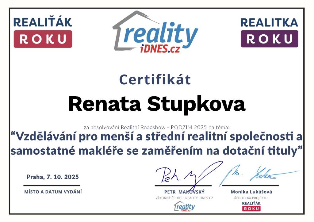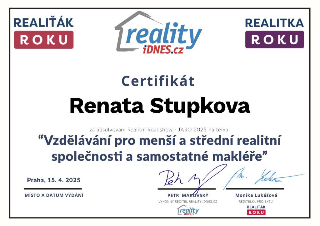 Paní Stupkovou jsem si vybral na základě předchozí pozitivní zkušenosti z doby, kdy se podílela na prodeji developerského projektu. Tuto nemovitost jsem předtím nabízel téměř tři roky prostřednictvím místní realitní kanceláře, v několika etapách, avšak bez úspěchu. Z tohoto důvodu jsem se rozhodl obrátit na paní Renatu, a to i přesto, že nemovitost se nacházela daleko od jejího bydliště. Dokázala si skvěle zorganizovat čas a efektivitu prohlídek a správně určila vhodnou cílovou skupinu. Do osmi týdnů od zahájení spolupráce byla nemovitost rezervována za cenu, na níž jsme se vzájemně dohodli. Ještě jednou děkuji za profesionální přístup a mohu s klidným svědomím doporučit.